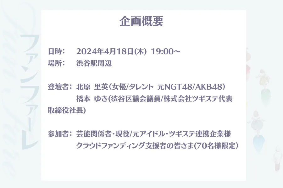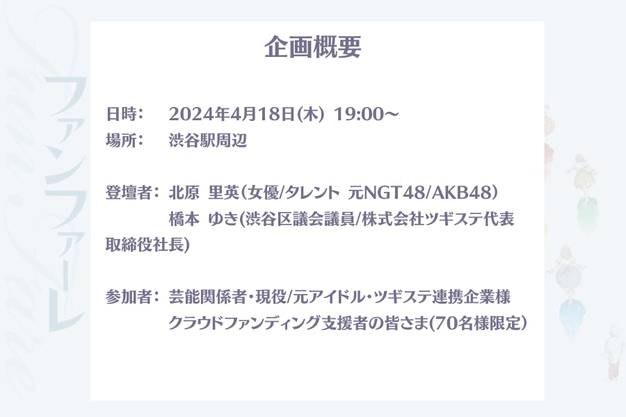 この映画はアイドルのセカンドキャリアを描いた作品です。多くの元・現役アイドルやアイドル関係者はもちろん、『夢を追いかけて挑戦をしてきた多くの方』に観て貰いたいという思いを込めて製作しました。この度、ツギステさんの協力により意義ある上映イベントを企画実施することなりました。