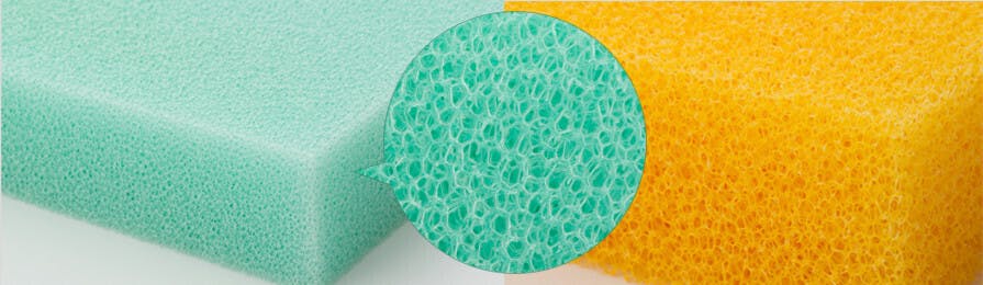 高機能なこのウレタンは、ウレタンフォームの気泡にあるフィルム状の膜を取り除き、空気や水を通り易くした無膜ウレタンフォームです。