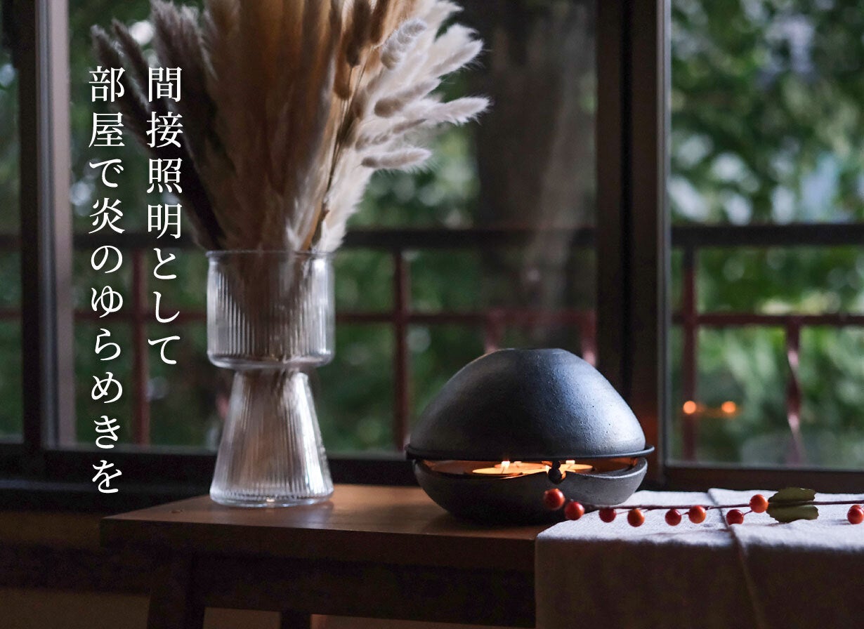 “灯”は、信楽焼で出来たドーム状の蓋がされる為、一般的なファイヤーピットとは異なり直接炎が露出することはありません。炎はドームの隙間から見えるようになっており幻想的な炎の揺らめきを存分に楽しむことができます。