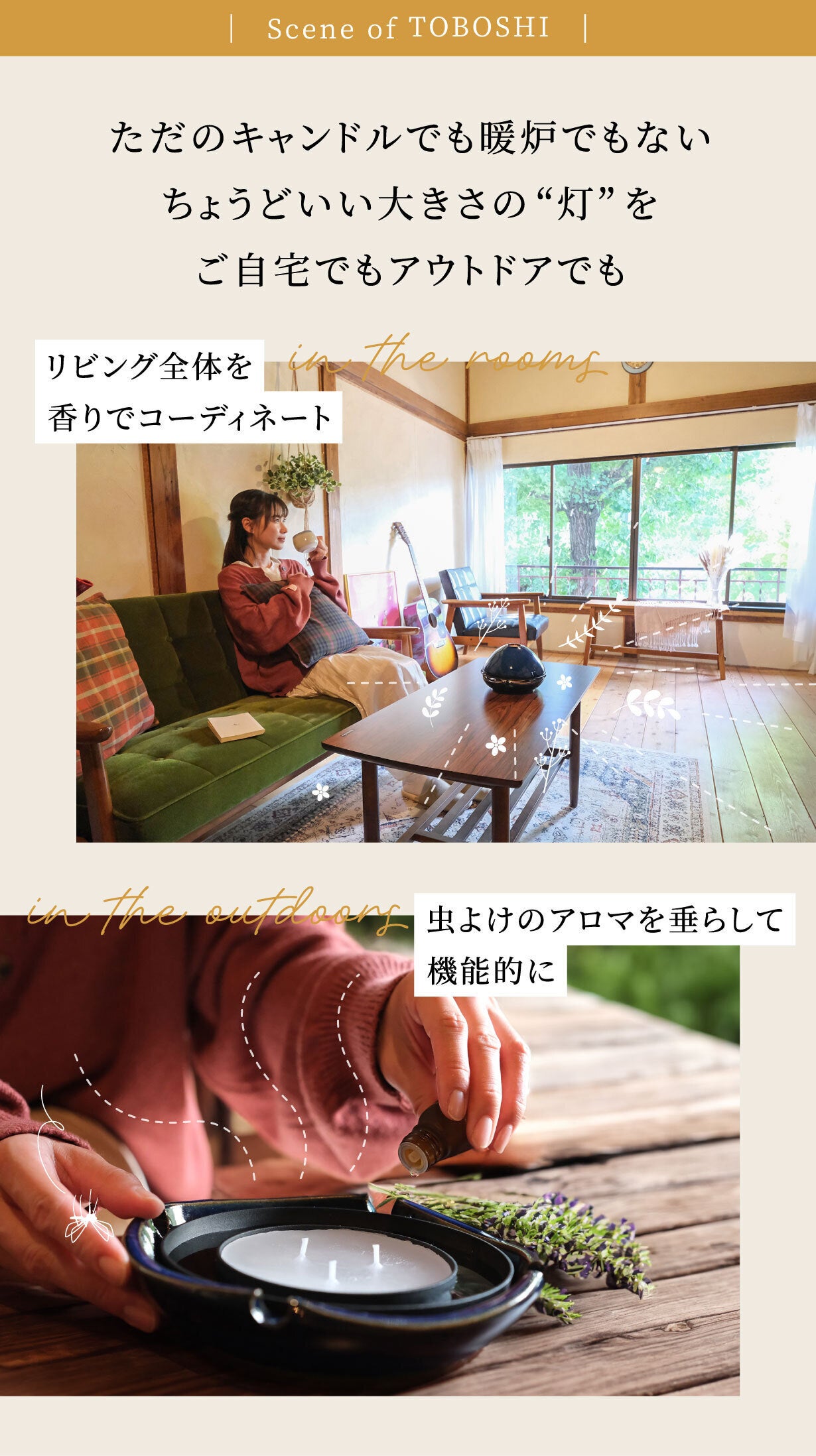“灯”(とぼし)は、ドームの中で炎を焚くので、使用中は火に直接触れる心配がないため、安全性も強化されています。ぜひ“灯”を通して「炎のぬくもりと香りでつくる癒し時間」を送って頂けると嬉しいです。