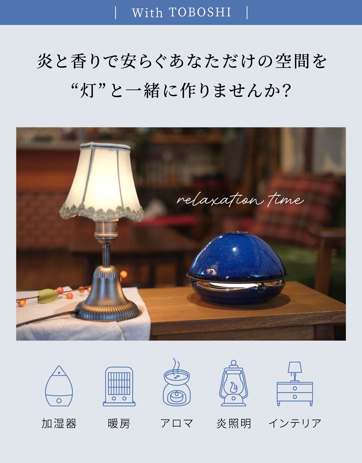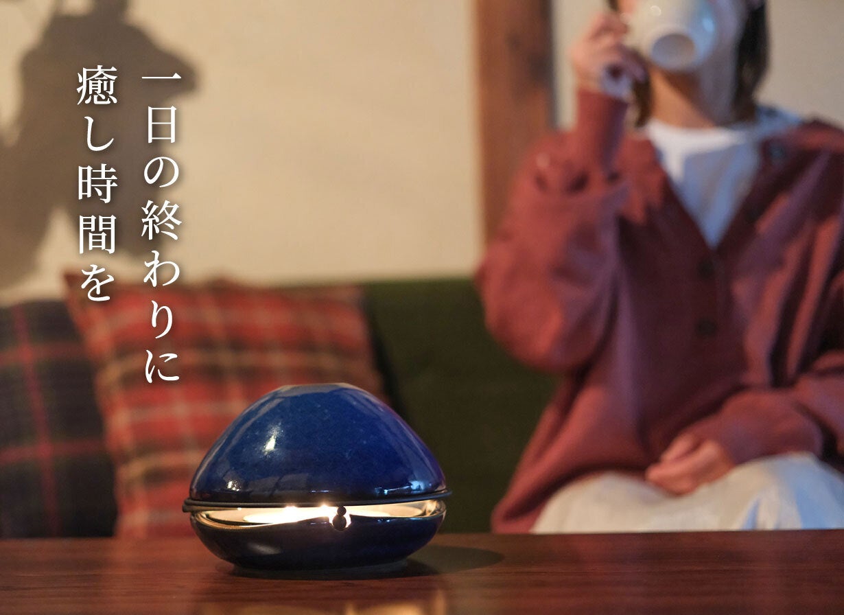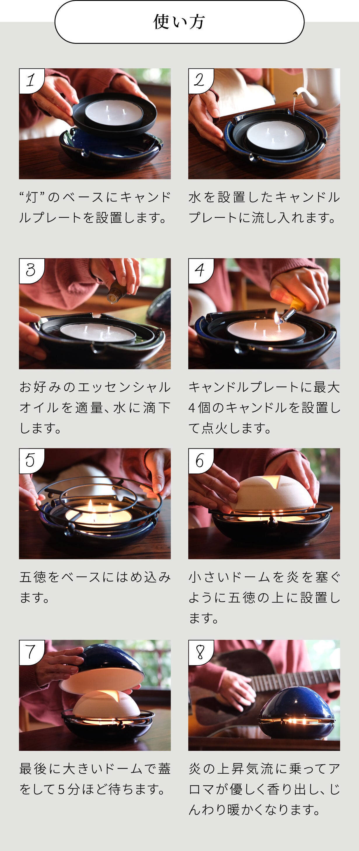A:“灯”は、ご自宅のキッチンやオフィスのどこでも、小さな部屋を暖める事が出来ます。また同時に加湿し、香りを与える役割も果たします。