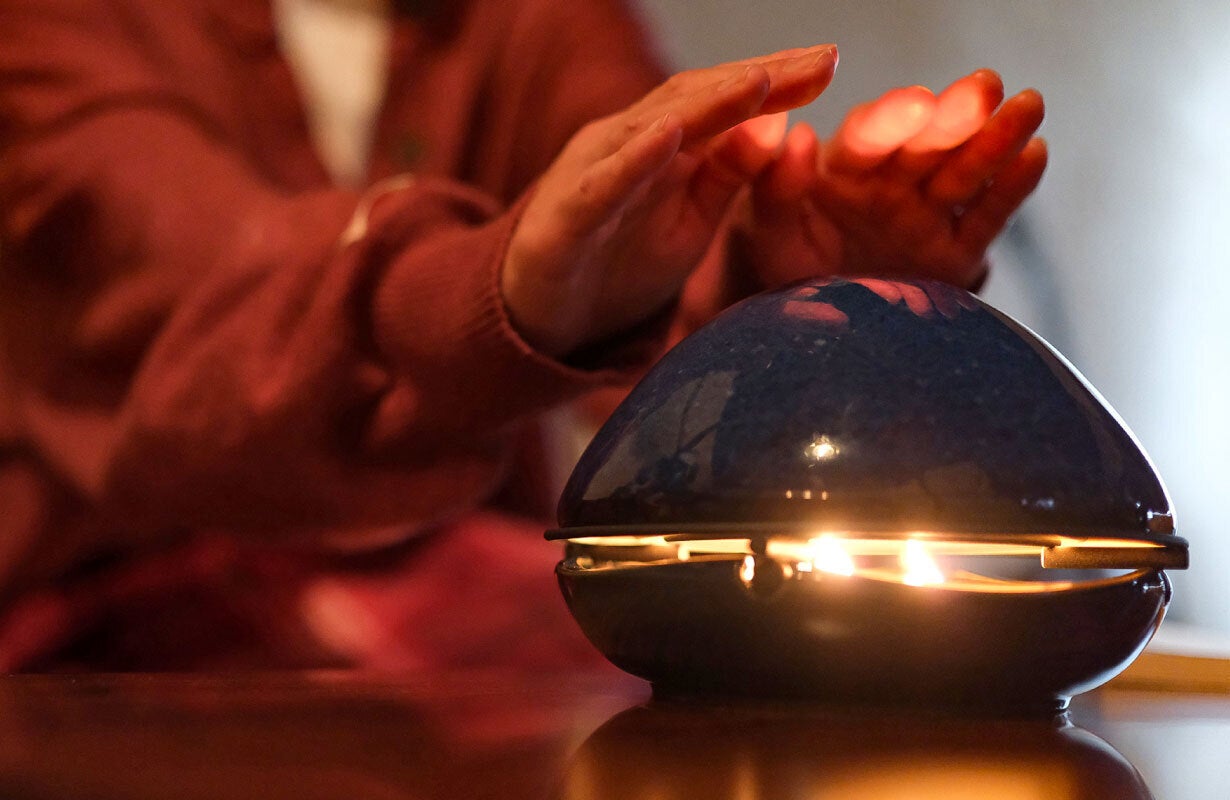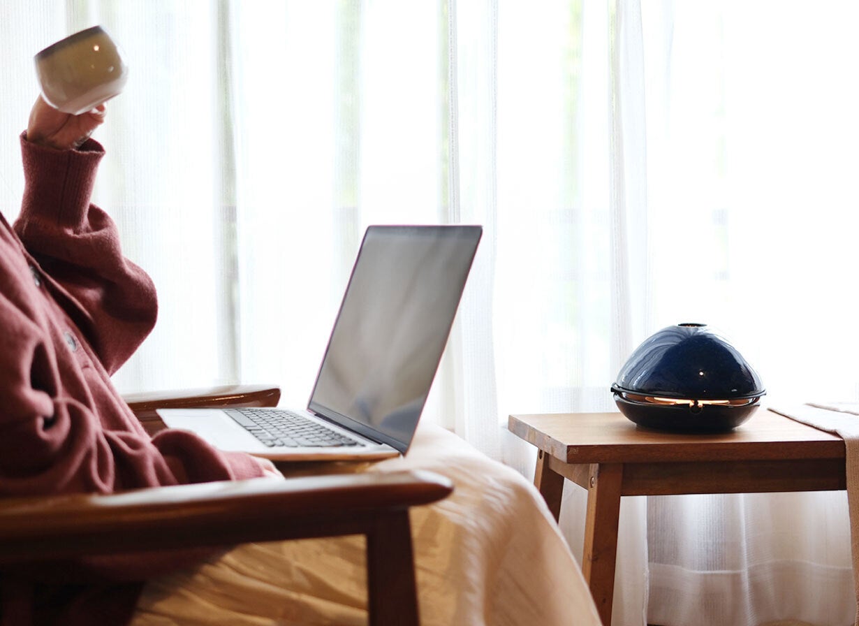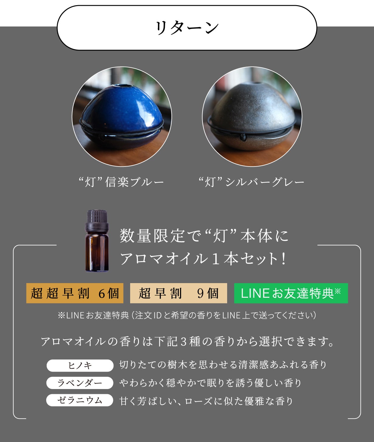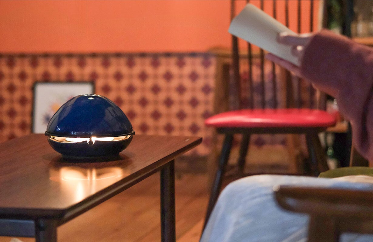 A:“灯”は、ご自宅のキッチンやオフィスのどこでも、小さな部屋を暖める事が出来ます。また同時に加湿し、香りを与える役割も果たします。