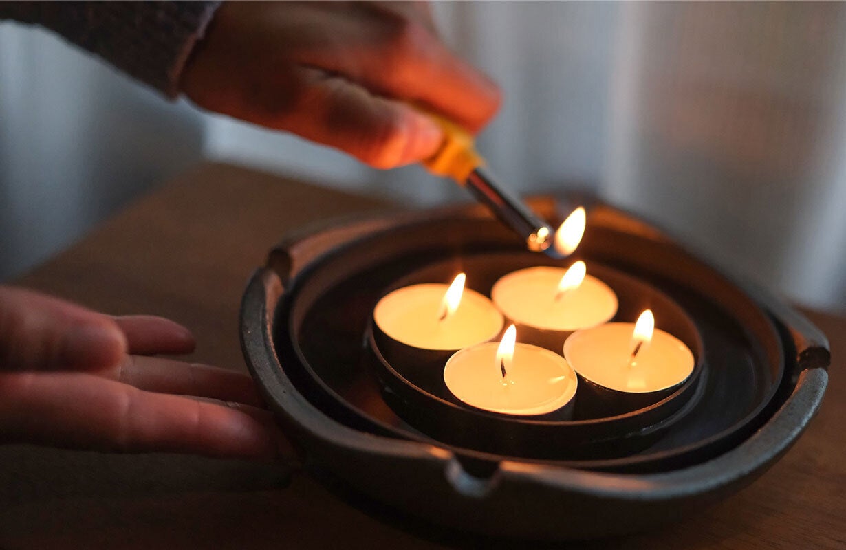 “灯”は無煙のキャンドルを使用する為、焦げた匂いも黒い煙もほとんど発生しません。キャンドルプレートで自然に鎮火する為、お部屋でもリビングでも使う場所を選びません。