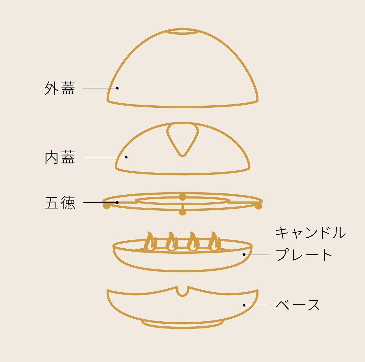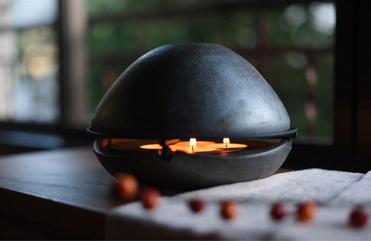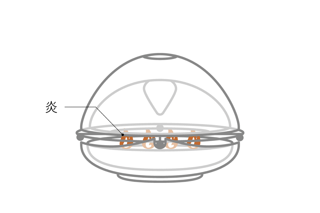 “灯”は、2つのドームで炎の熱をためることでアロマの香りを含んだ水が霧へと変わっていきます。発生した蒸気は炎の上昇気流を利用して一気に部屋に拡散され安らぎの香りで部屋が満たされていきます。