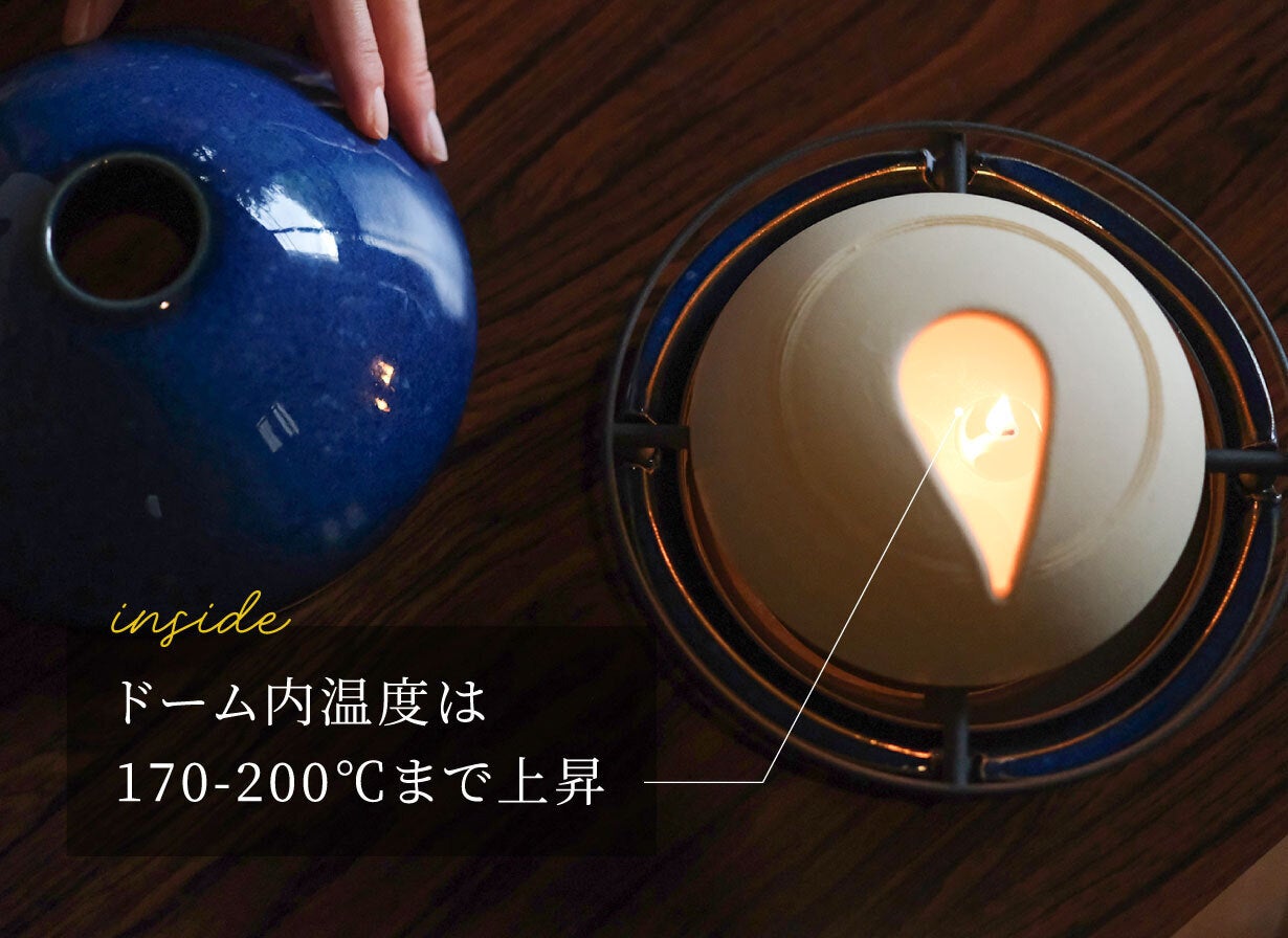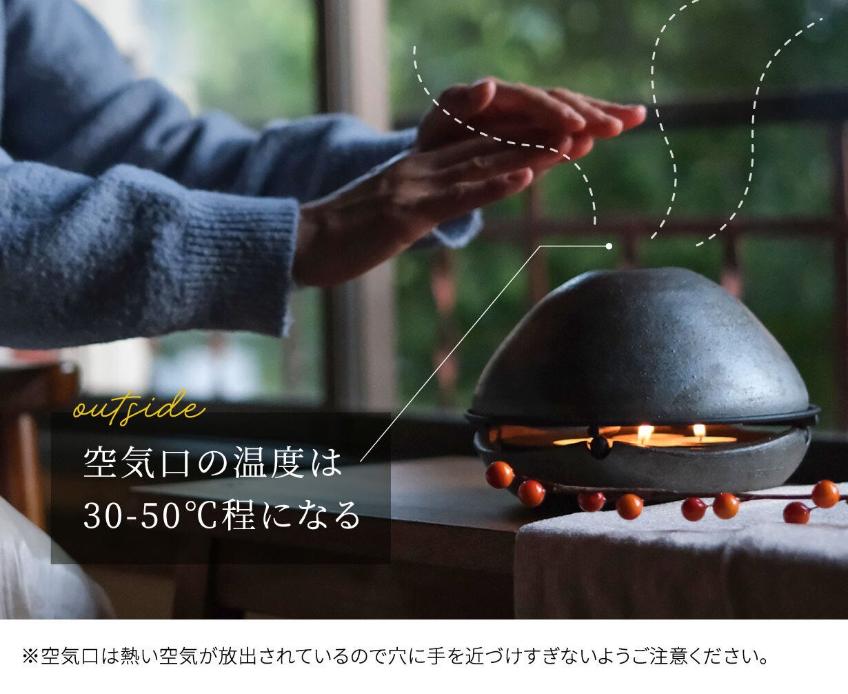 “灯”は火を灯してから5分程度で本体が適温まで暖まります。小さいドーム内は170-200℃まで温度が上昇し、空気を暖めながら30-50℃程になり空気口から外へ放出されていきます。