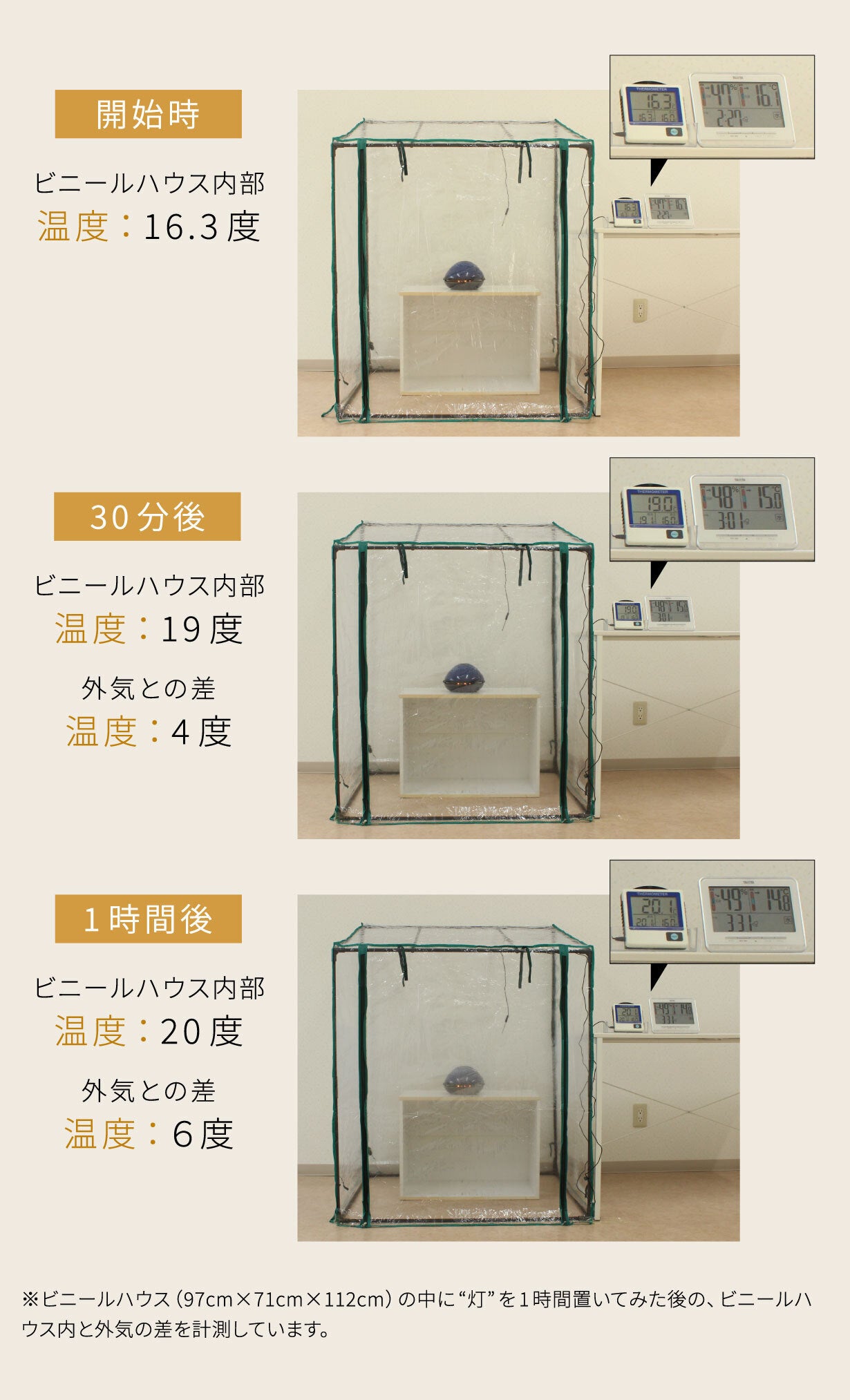 どのくらい“灯”でビニールハウス内部の温度が暖かくなるか検証した所、【1時間で約4℃上昇】しました。小さいからといって侮れない程「暖房器具」としても優秀で、安らぎを覚える心地よい暖かさであなたを包んでくれます。