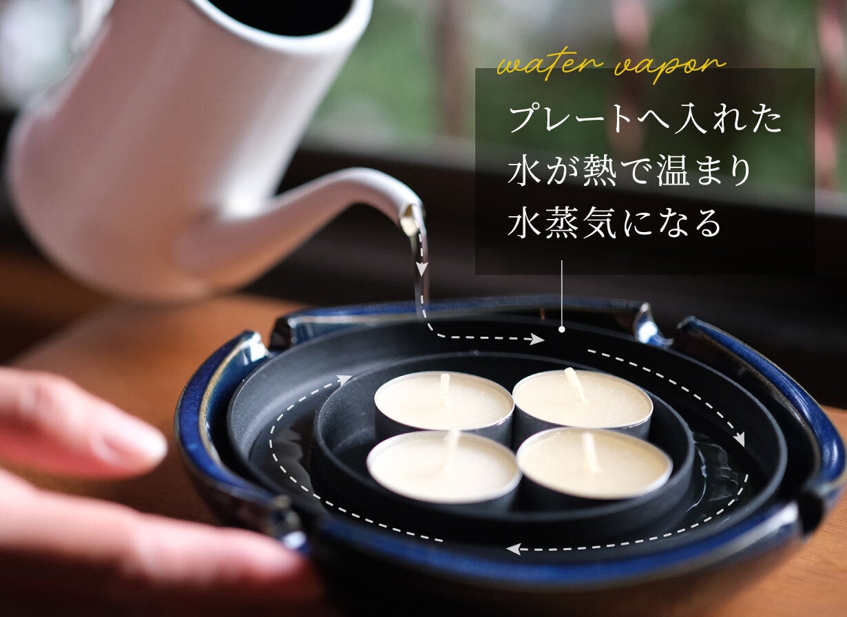 数滴のエッセンシャルオイルを水に混ぜてキャンドルプレートに入れれば、数分もしないうちに、家中が心地よい持続性のある香りで満たされます。最大4つのキャンドルを設置することができ約5時間の使用ができます。