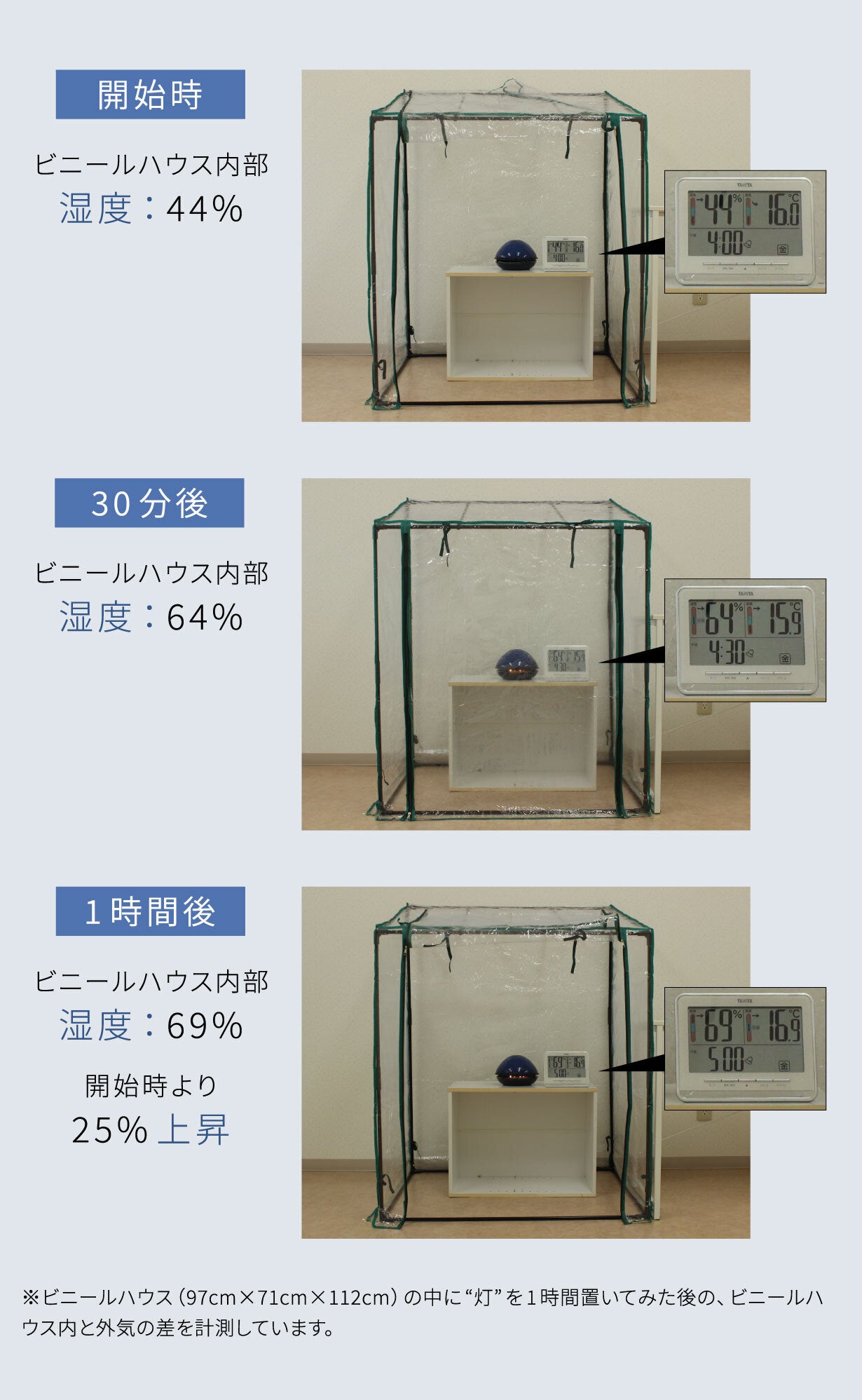 どのくらい“灯”でビニールハウス内部の湿度が上がるか検証した所、【1時間で約25%上昇】しました。“灯”はアロマの香りに浸りながら部屋に潤いを与えてくれる優れものです。