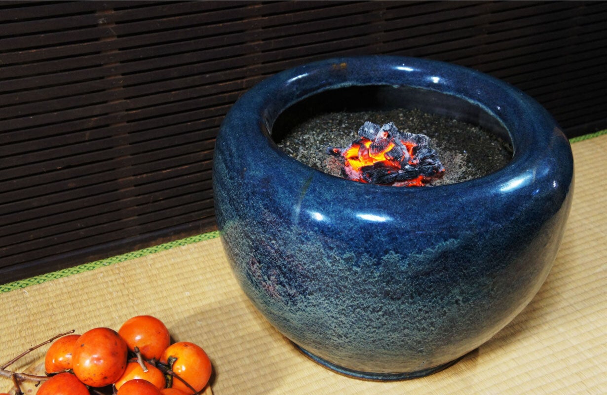 火鉢は炭を入れて火を起こすことで「五徳(ごとく)をたててやかんでお湯を沸かしたり」「網焼きでお餅や魚を焼いたり」「手を温める暖房具」として約80年前は活躍していました。そんな伝統ある「信楽焼の火鉢」を現代の生活で復活させたいという想いから象徴的だった「信楽ブルー」を採用しました。
