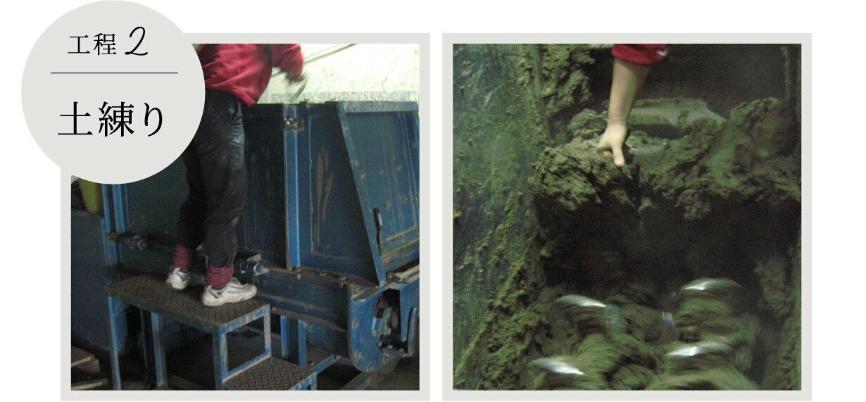信楽で産出される良質の陶土を、成形できる陶土へ調合します。さまざまな土の性質を知り、混ぜ合わせたりすることでさらに良質の陶土へと変化します。掘ったばかりの土では陶器(信楽焼)にはなりません。かなり大切な作業です。