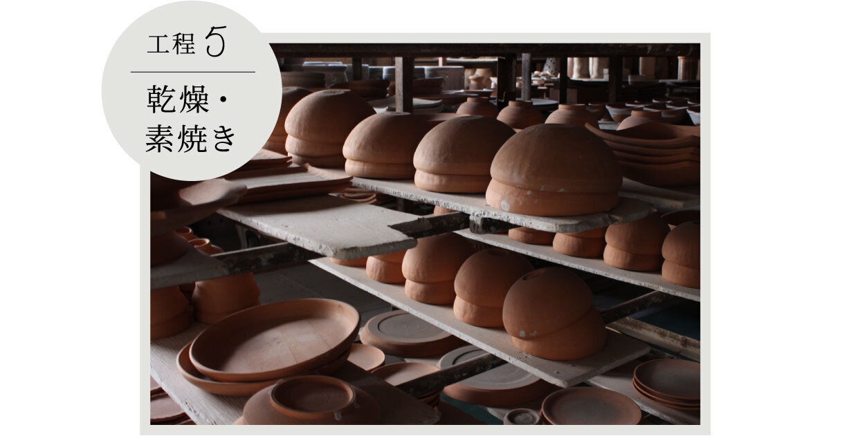 成形した陶土をよく乾燥(約2~3日)し、約700~800度程度の温度にて素焼きします。乾燥が不十分な場合、本焼で商品にひびなどが入ってしまいます。