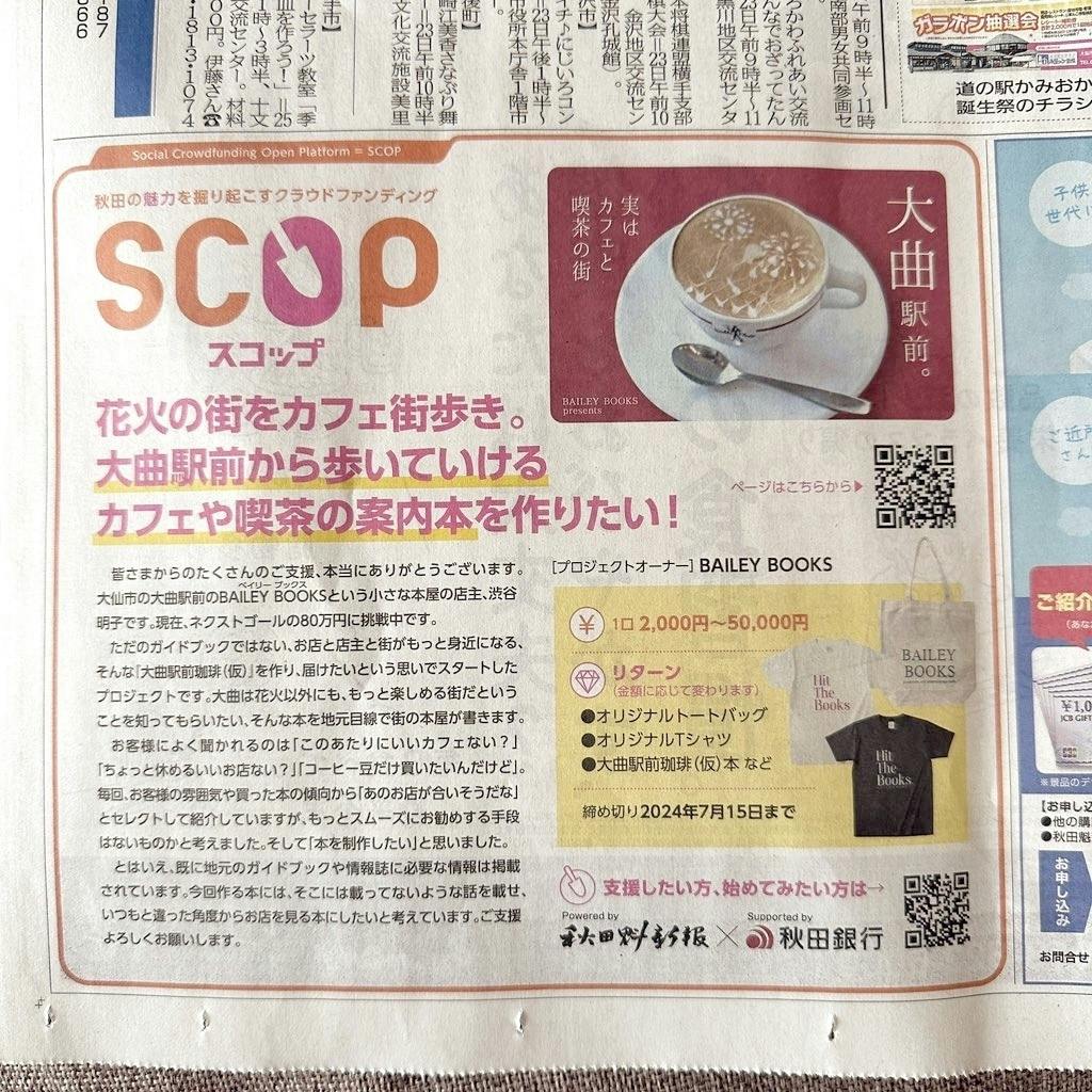 今回のクラウドファンディングは、秋田魁新報社さまと秋田銀行さまの協力によるSCOPを利用しています。そのSCOP最後の広告が、今朝の朝刊に掲載されました。
