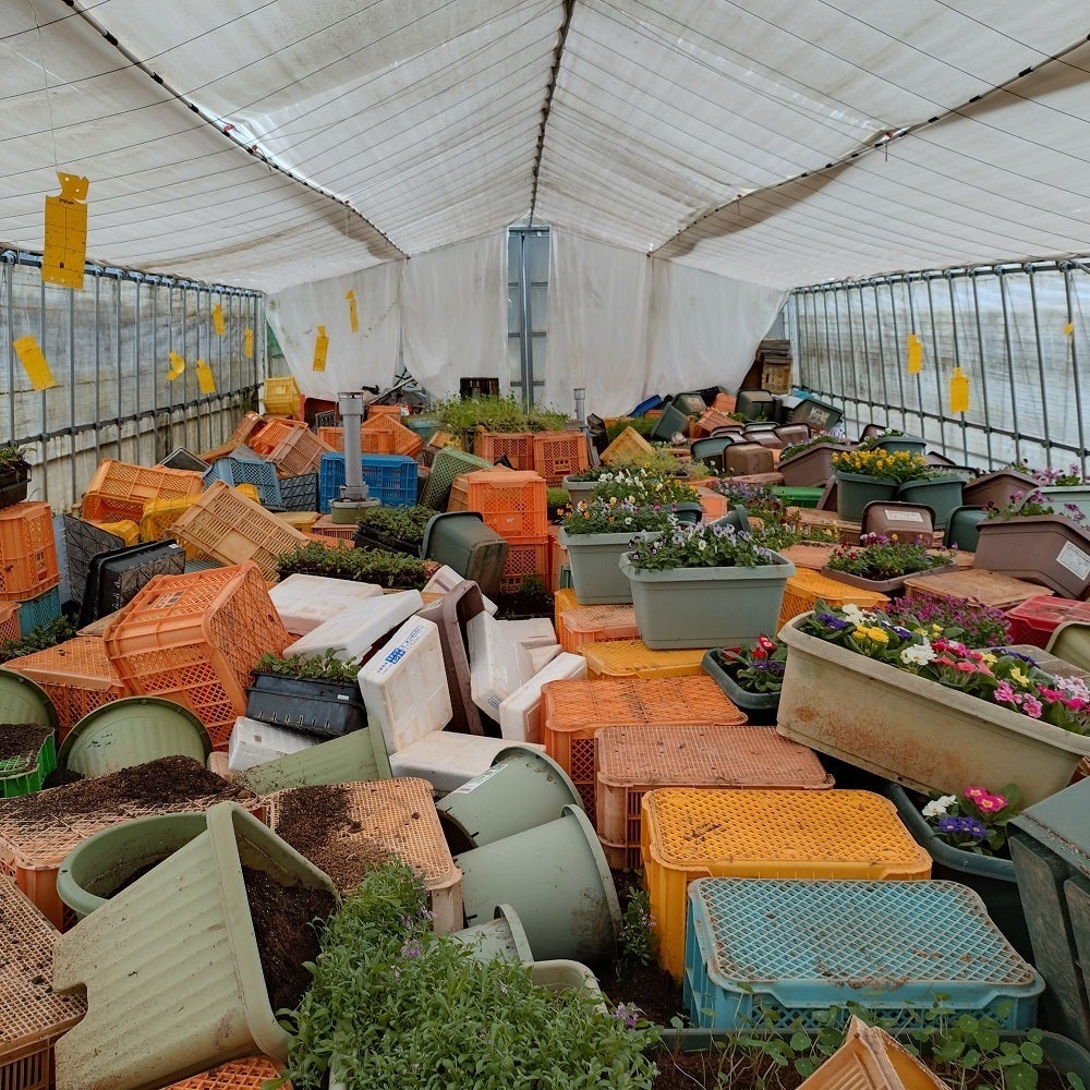 ※ハウス内部も同様で出荷間近のハーブやエディブルフラワーは崩れてしまいました。いち早く駆けつけてくれたシェフの助けで、多くの鉢を助けることが出来て感謝しかありません。