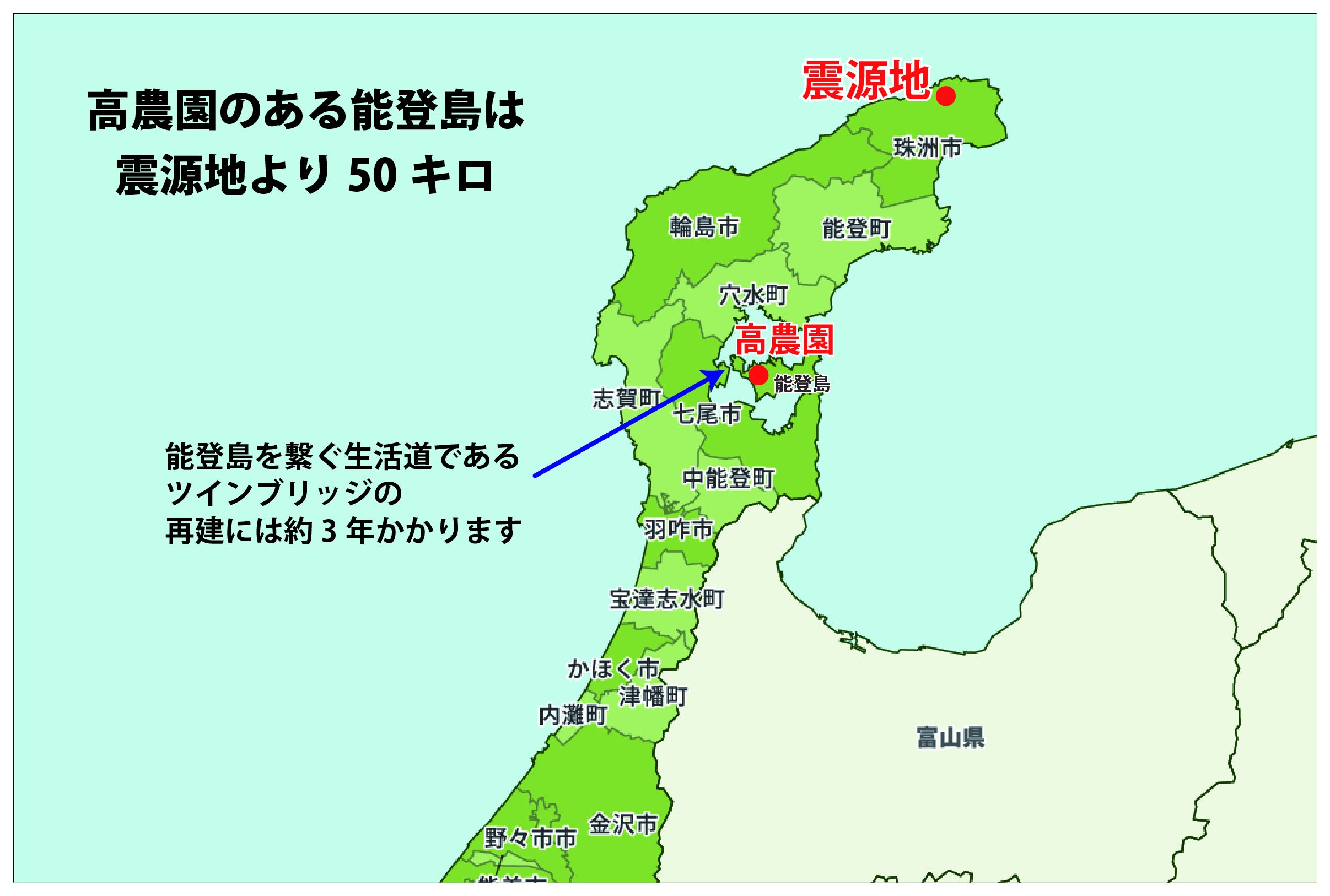 NOTO高農園は震源地から約50キロに位置する七尾市能登島にあります。