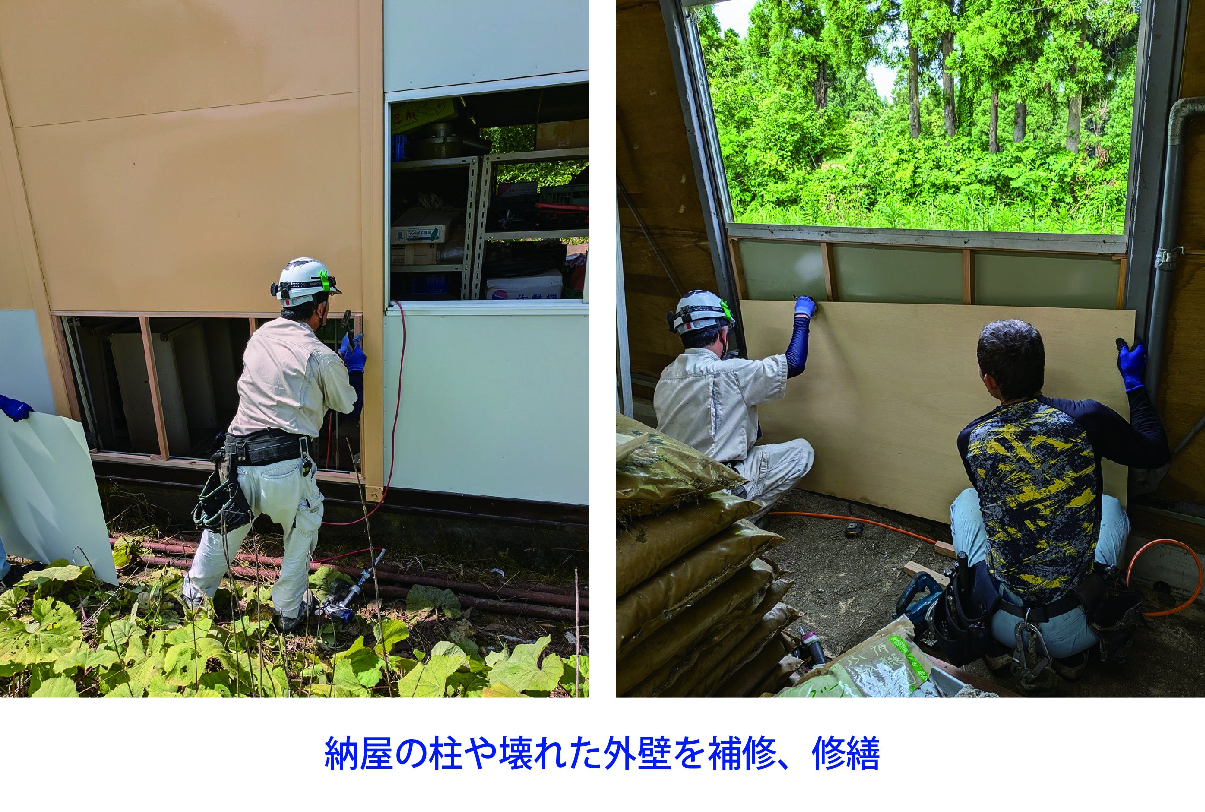・破損した窓ガラス、納屋の外壁が剥がれたことによる雨漏り等2次被害を防ぐための応急処置