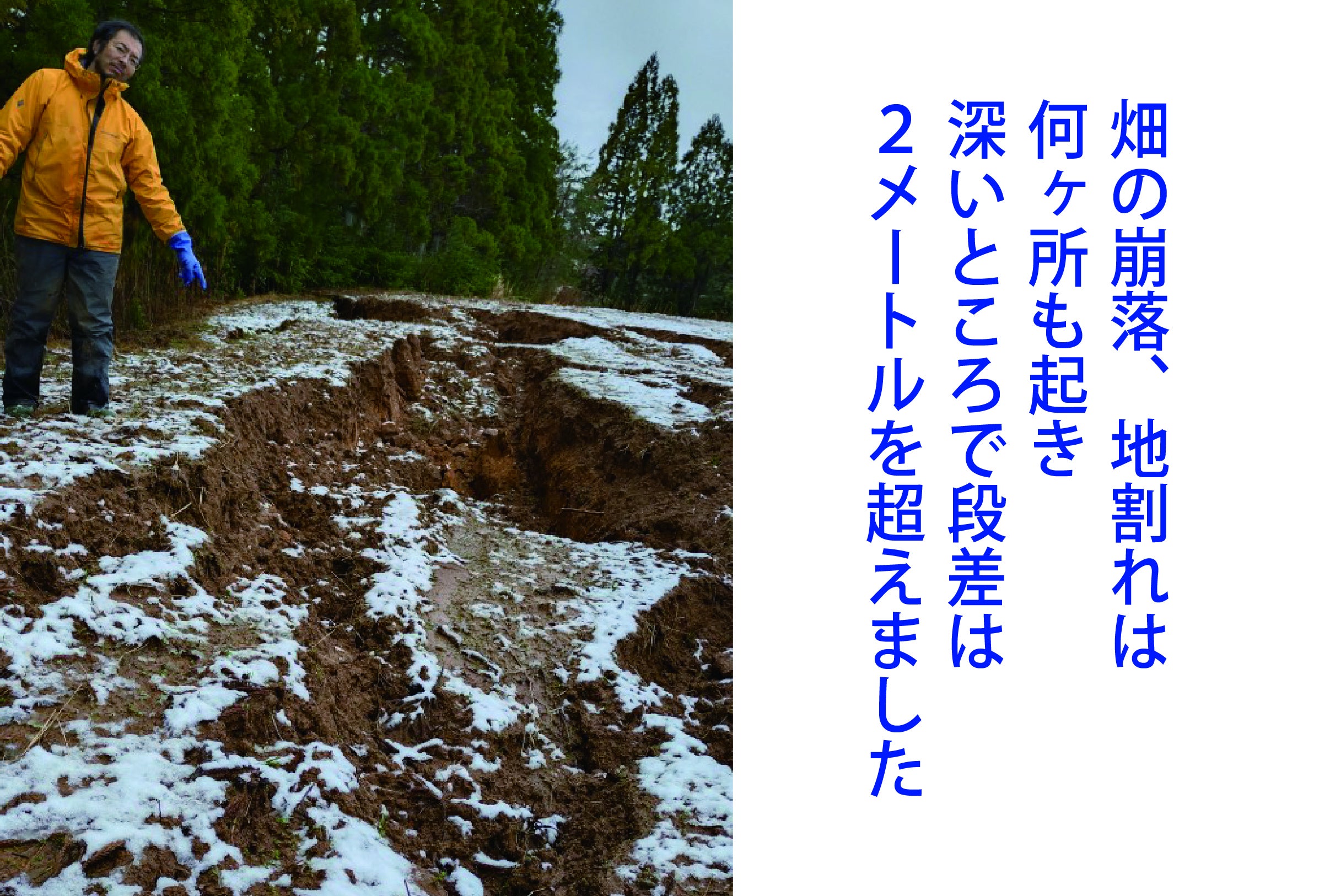 ※震災で地割れした畑の修繕も行ってきました。畑の地割れは作物の栽培に大きな影響を与えるため、早急な対応が求められ、避難所から通うスタッフ達と協力し、畑の再生を進めてきました。