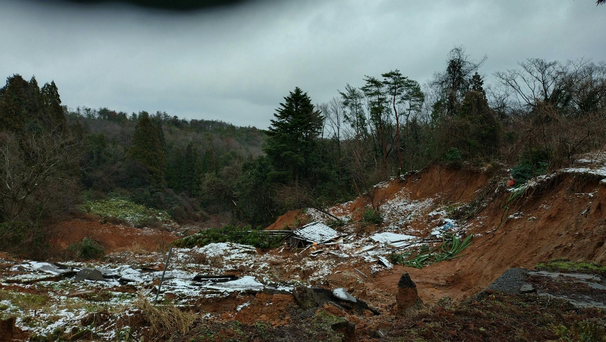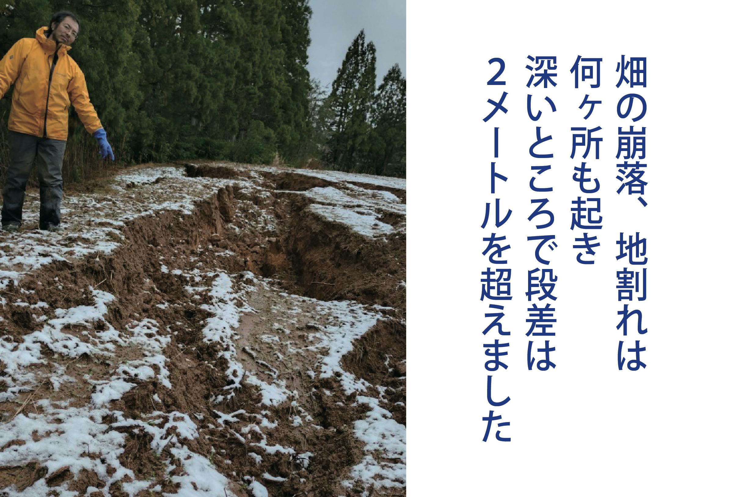※大規模に崩落した畑と納屋、パイプラインも完全に壊れ未だ復旧の目処は立ちません。