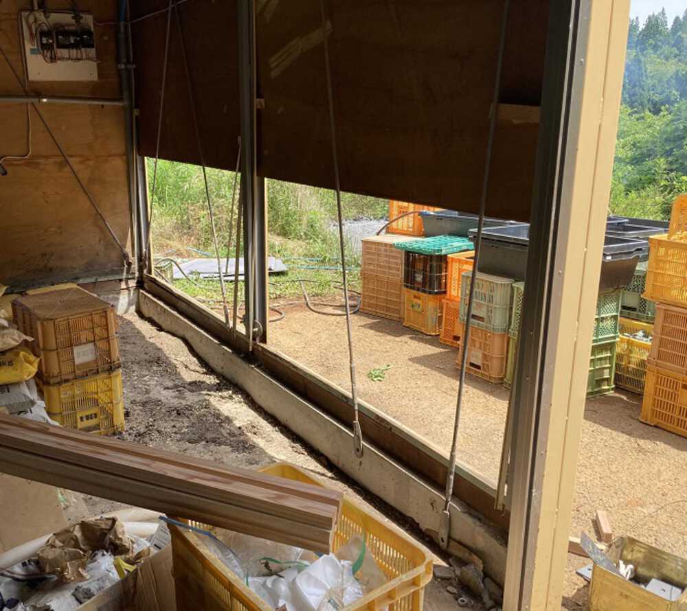 建築チームが作業に入る前に、納屋に納めていた多くの肥料や資材など崩れて整理もできていなかった屋内を片付ける作業に着手。スタッフ総出で一旦納屋の外に運び出し、仕分けして格納庫まで運び込みました。思った以上に重労働で1週間かかりました。