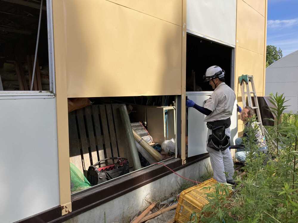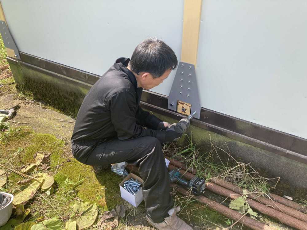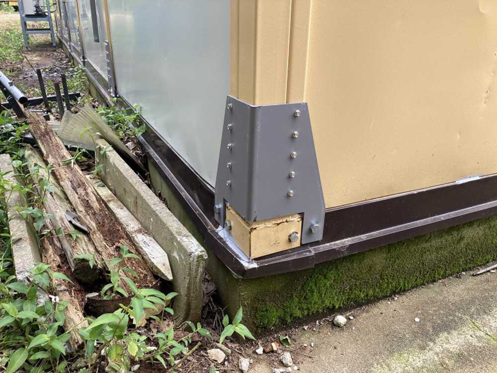 倉庫を空けたら、建築業者の方が壁を剥がしていきながら見えていなかった部分の修繕箇所を確認して行きます。基礎のボルトが地震の揺れに耐えられず、全て折れてしまい強度が耐えられないことがわかり、建替えずに何とか修繕をする知恵をご提案いただき、特別なプレートを作っていただき、強度を高めた補強工事いただくことになりました。