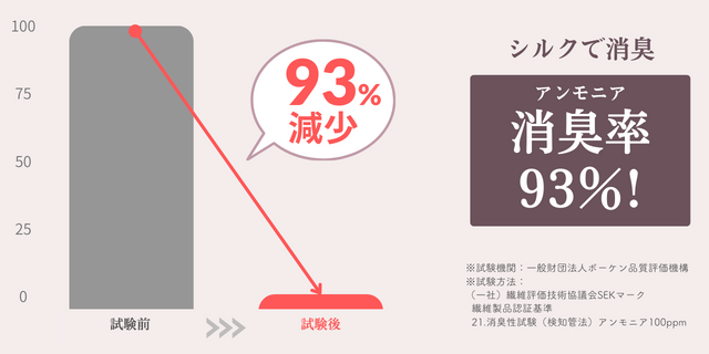 シルク自体が持つ消臭機能を活かし、薬剤や特殊な加工を使用せず、天然繊維だけで、気になるアンモニア臭を93%消臭する機能を実現しています。