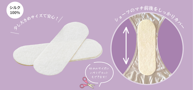 シルク100%を使用した、ショーツに貼って使用するタイプのおりものシートです。