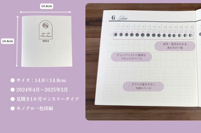 月の満ち欠けと、新月・満月の日が分かるマンスリータイプのスケジュール帳です。女性の身体は、月の満ち欠けと深く関わっていると言われています。
