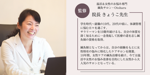 温活・女性のお悩みを専門とする鍼灸院の院長きょうこ先生に、商品の企画段階から監修アドバイザーとして参加して頂きました。