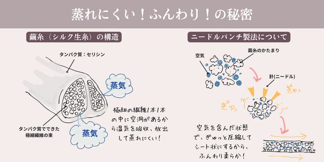 中空繊維であるシルクと、空気を含んだ製法によって、湿気がこもりにくく蒸れにくいので、快適な着け心地です。