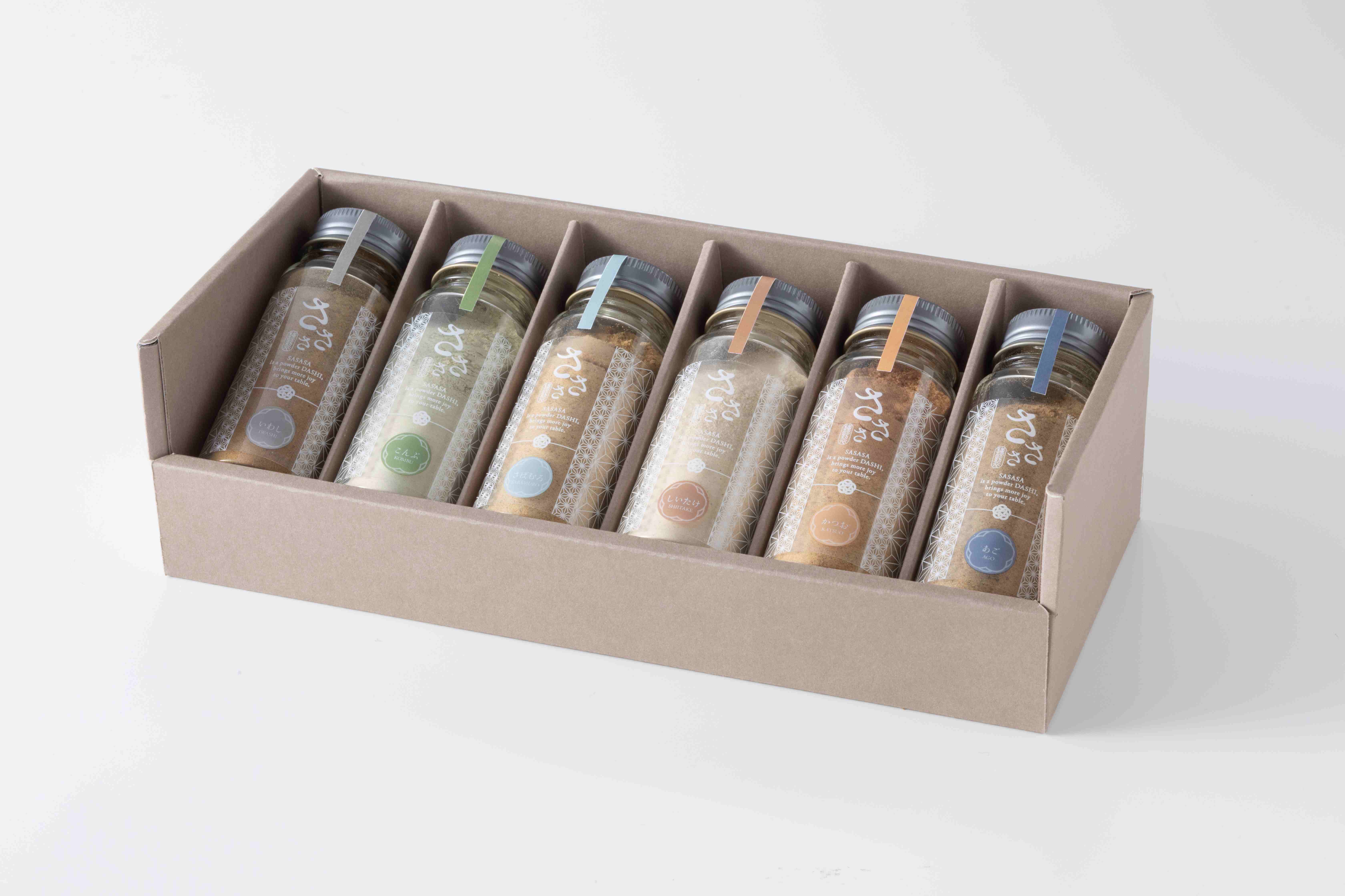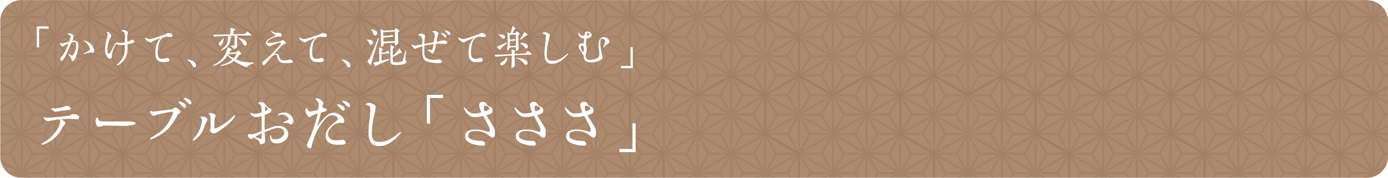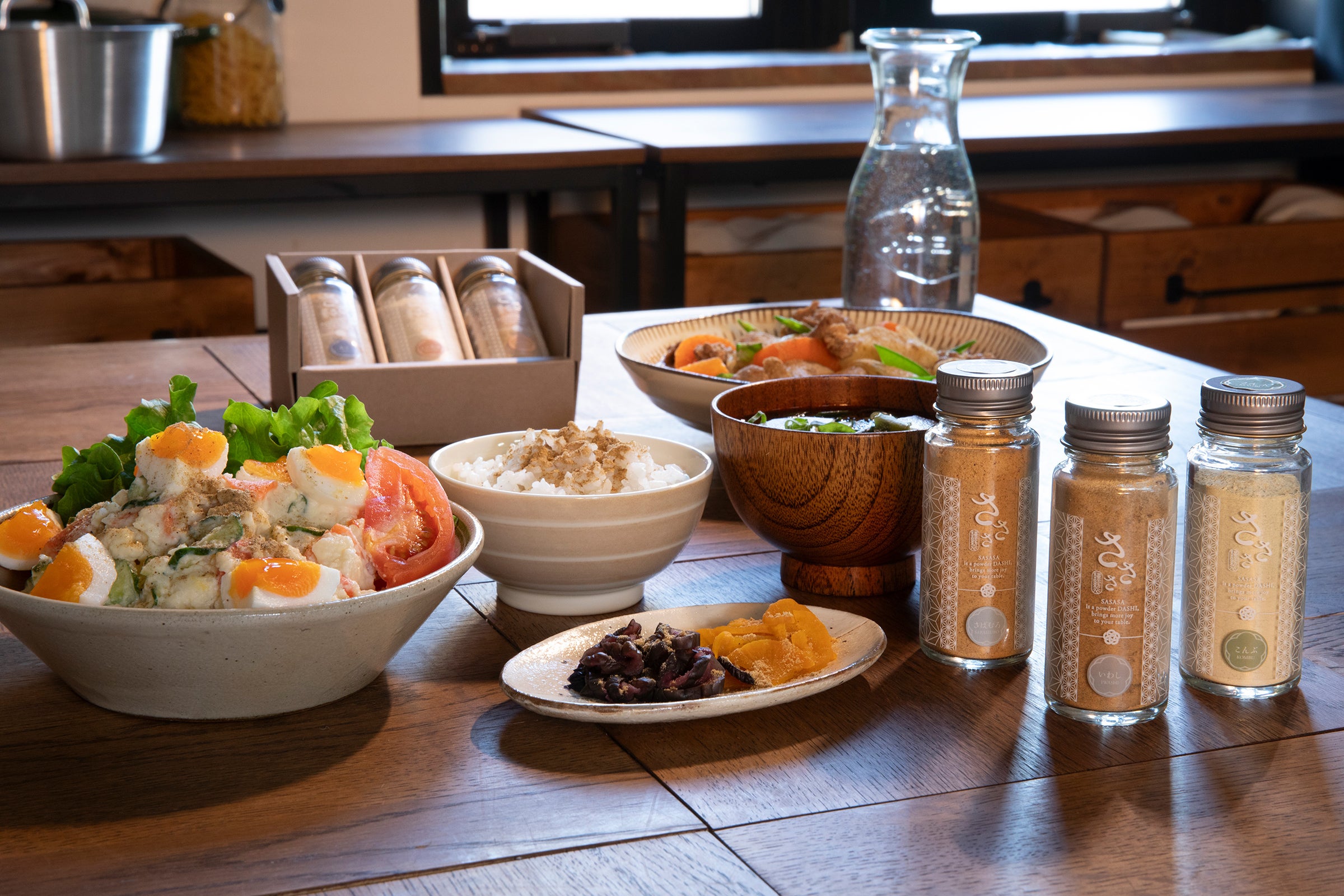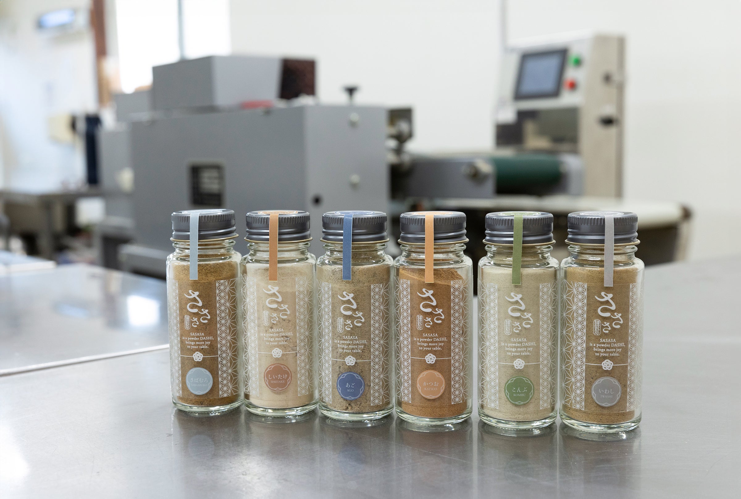 テーブルおだし「さささ」とは、その名の通り、できあがった料理に振りかける食卓で使う商品です。フレーバーは「かつお」「飛魚」「鯖むろ」「いわし」「こんぶ」「しいたけ」の全6種類。さまざまなフレーバーを振りかけるながら混ぜることで、上品で繊細な味の変化を楽しんでいただく、新しいおだしです。
