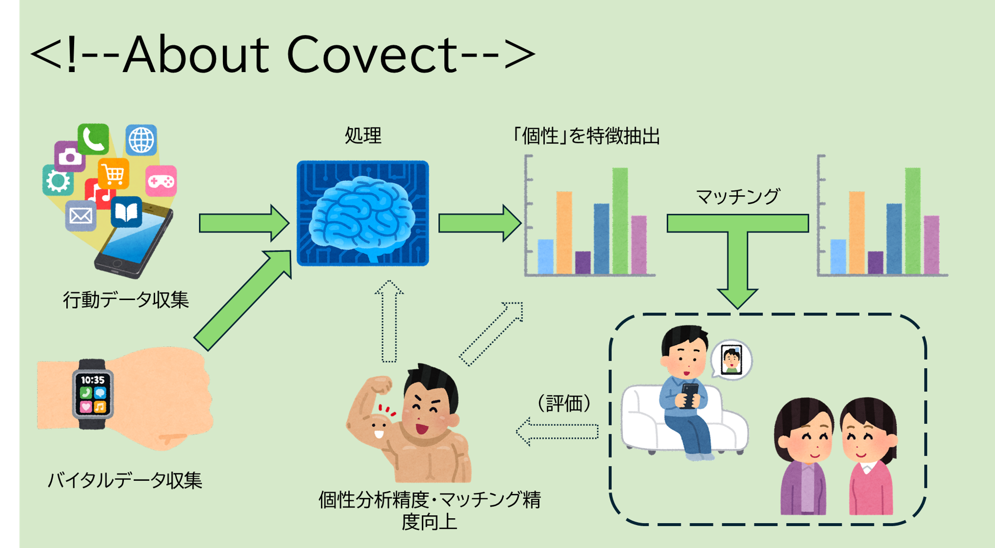 そこで私たちは全く新しいマッチングサービス、「Covect」を提案します。Covectはその人の訪れた場所やコンテンツ視聴履歴、検索履歴等の「行動データ」と、運動量、心拍数、睡眠状況等の「バイタルデータ」を収集し、AIによって機械的に分析、その人の「個性」を調べます。その「個性」を基に自分と相性の良い人や組織とのマッチングを行います。