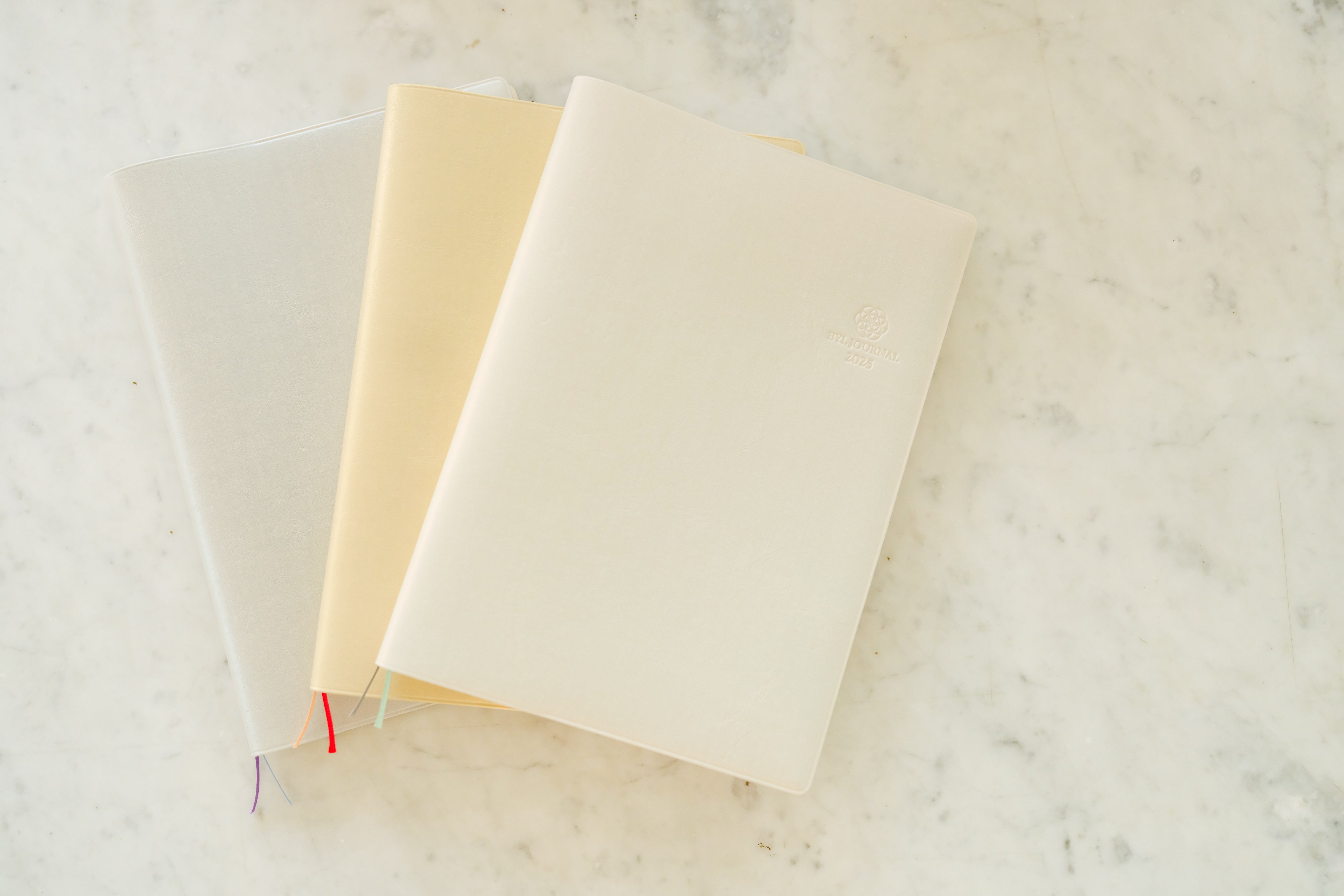 手帳のカバーは光沢感がありつつも汚れにくく、いつでも手元におきたくなる3色のカラー展開。しおりはカバーの雰囲気に合う色を1つ1つコーディネーターが選定。紙は裏移りせずボールペンでも滑らかに書ける用紙を使用。180度ピタッと開ける「糸かがり製本」を採用したことで、どのページを開いてもストレスなく書き込めます。カバー加工〜印刷・製本まで、全てのプロセスを国内で行い、品質にとことんこだわる手帳製造会社様と共に制作しています。