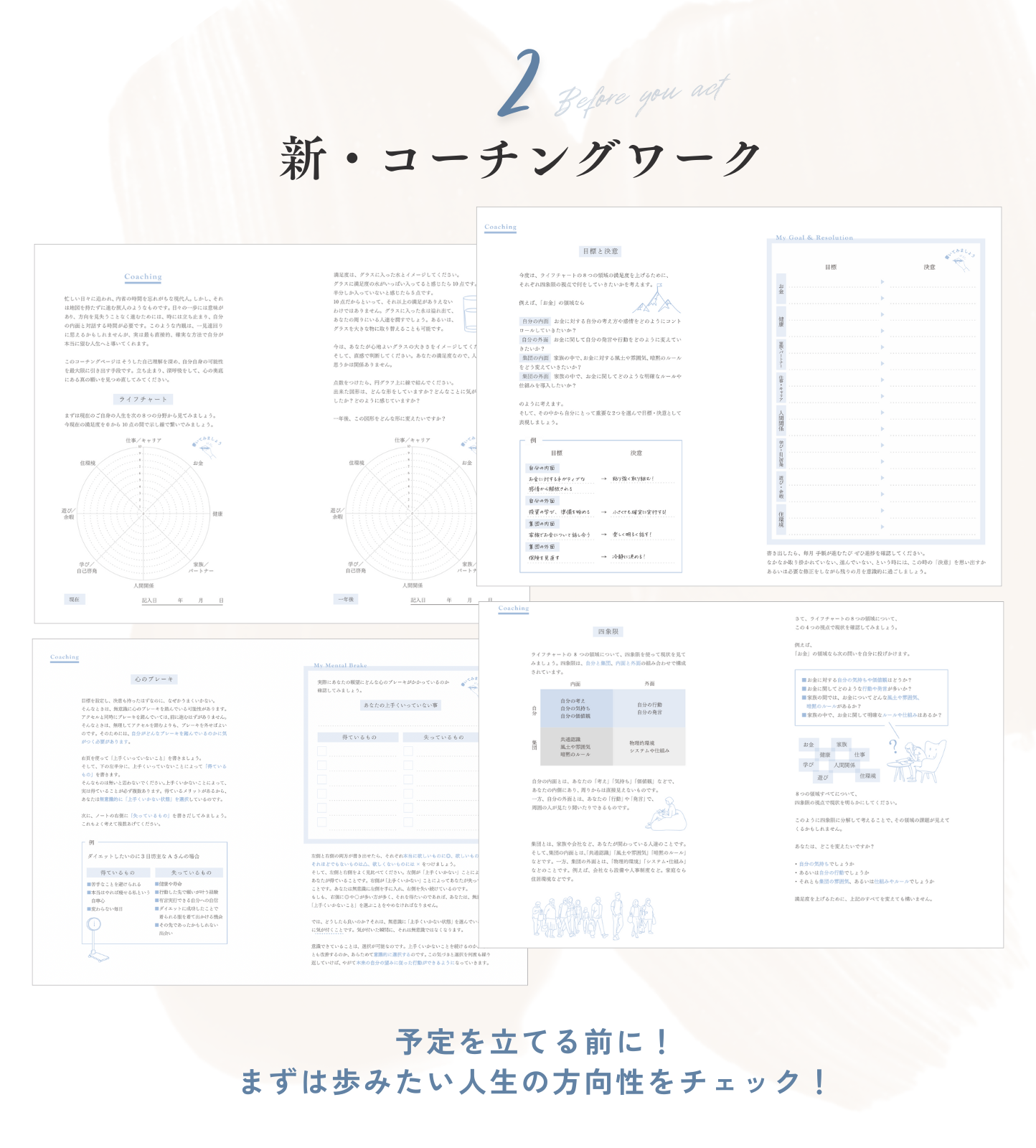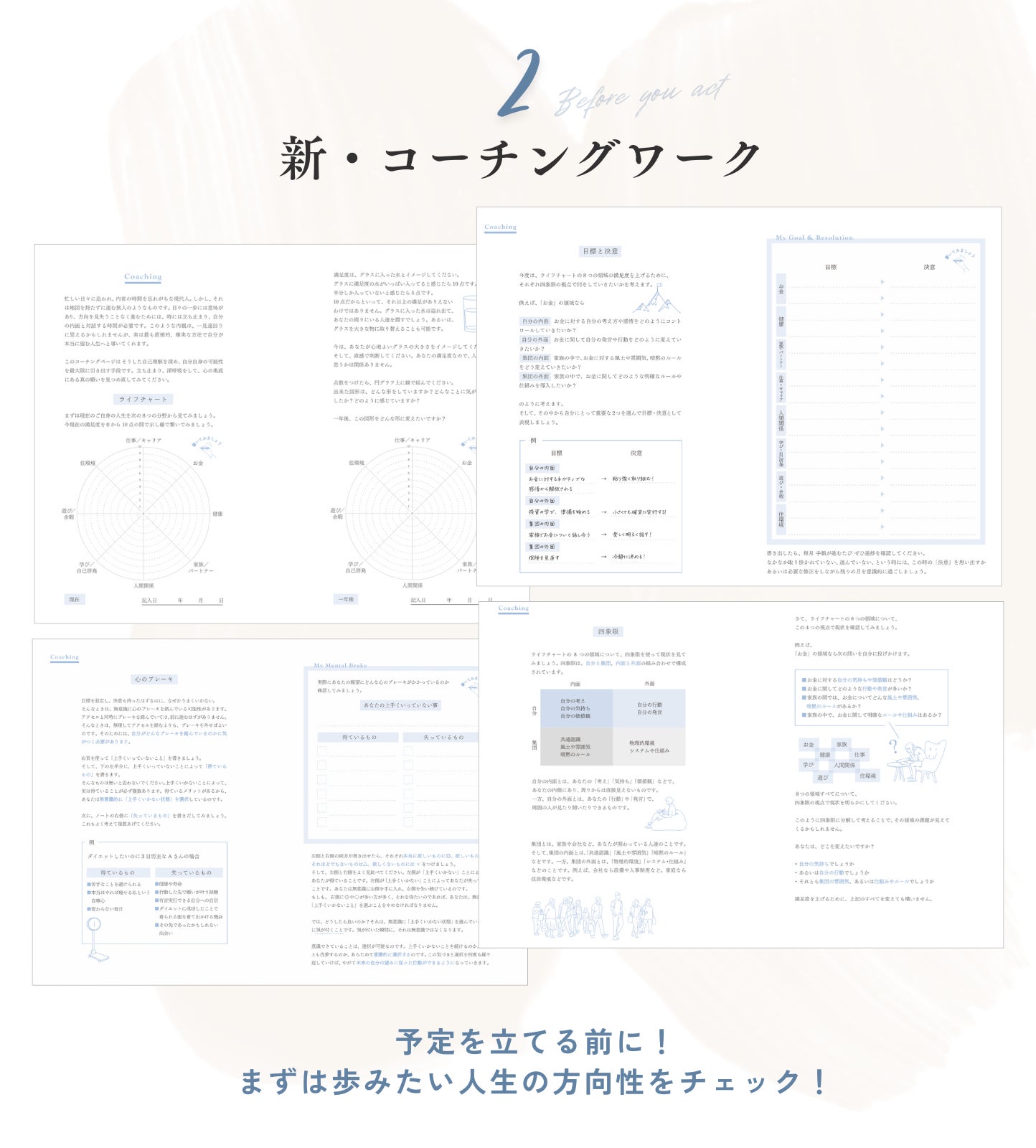 ▲コーチング協会理事がこの手帳のために監修した見開き全7ページにわたる本格的な完全オリジナルワーク!視点の転換と気づきに溢れる新ワークおよび、『戦略的に人生を創造するためのチェックリスト』付き!「本当はどんなふうに生きていきたいのか?」日々の忙殺の中で、本当に自分が心から望んでいることを見つめる機会も少ないはず。BYL JOURNALのオリジナルワークで「生き方そのもの」に向き合える機会をご用意しています。