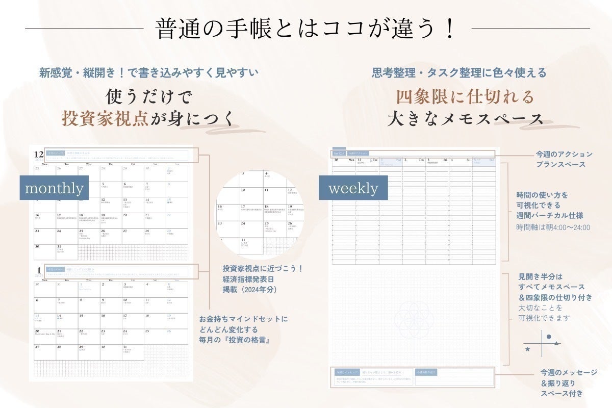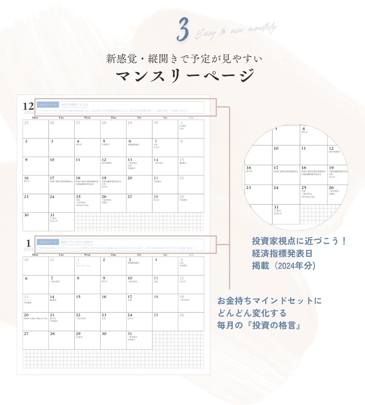 ▲PC横にもちょうど収まる縦使い仕様。2ヶ月分の見開きが先の予定まで見通しやすく、講座運営をする起業家にもおすすめ!目先の予定のみでなく、先のことも視野に入る設計。2024年分の経済指標発表日や投資に関する予定も記載されているので大切なイベントを見逃さず資産も増やそう!