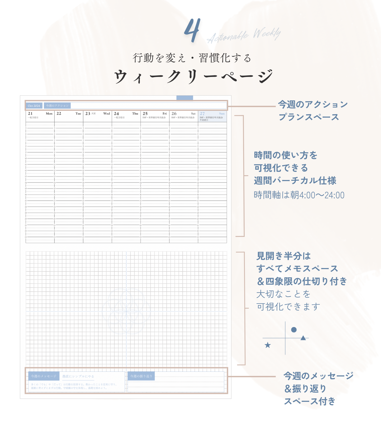 ▲30人のプロジェクトメンバーで、細部までこだわって制作したバーチカルのウィークリー。朝の時間を有効活用できるよう4:00〜24:00までの時間軸。見開き1/2は四象限の仕切り付きオールメモページ!本質的なタスク管理やメモなど、用途に合わせて使える自由度の高さがポイント。時間の使い方を通じて、真に豊かでマインドフルな人生創造をサポート。