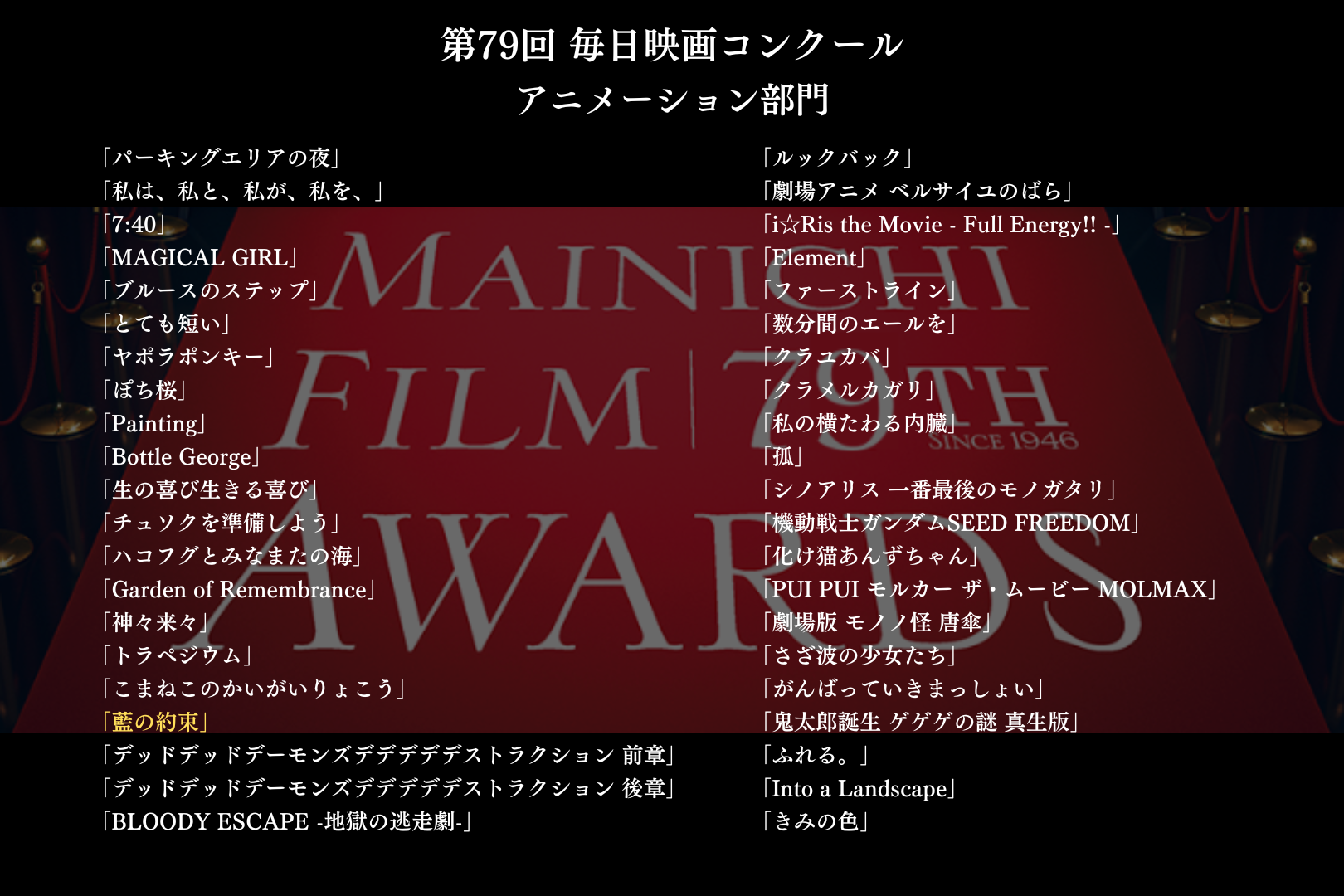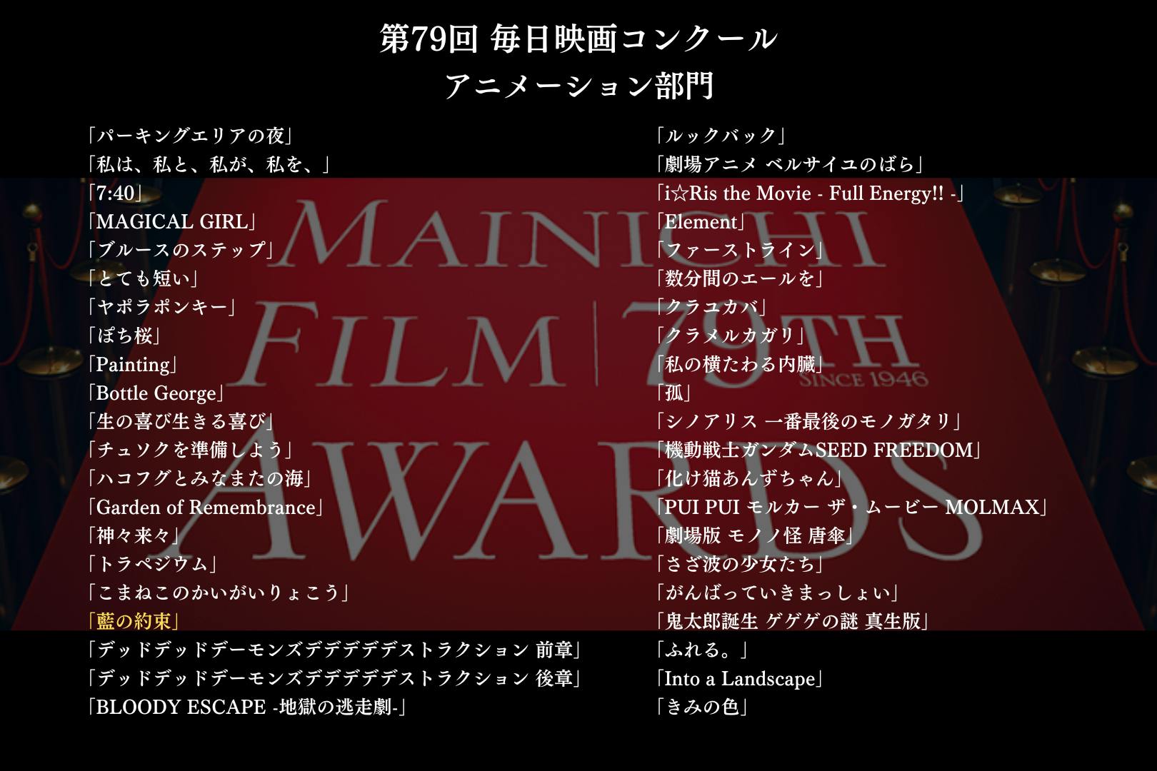 この度、「藍の約束」が毎日映画コンクール アニメーション部門にノミネートされました。