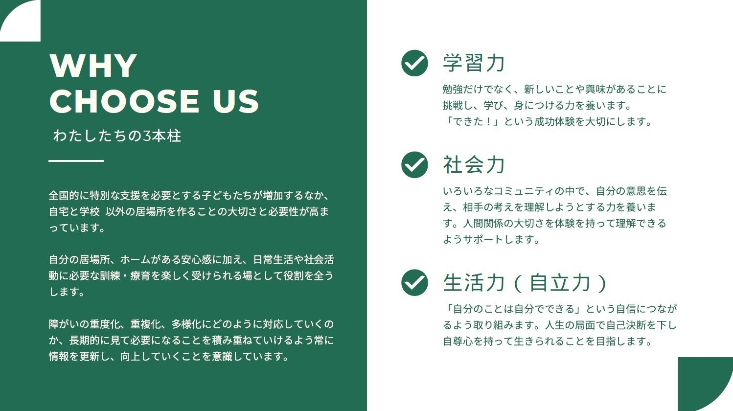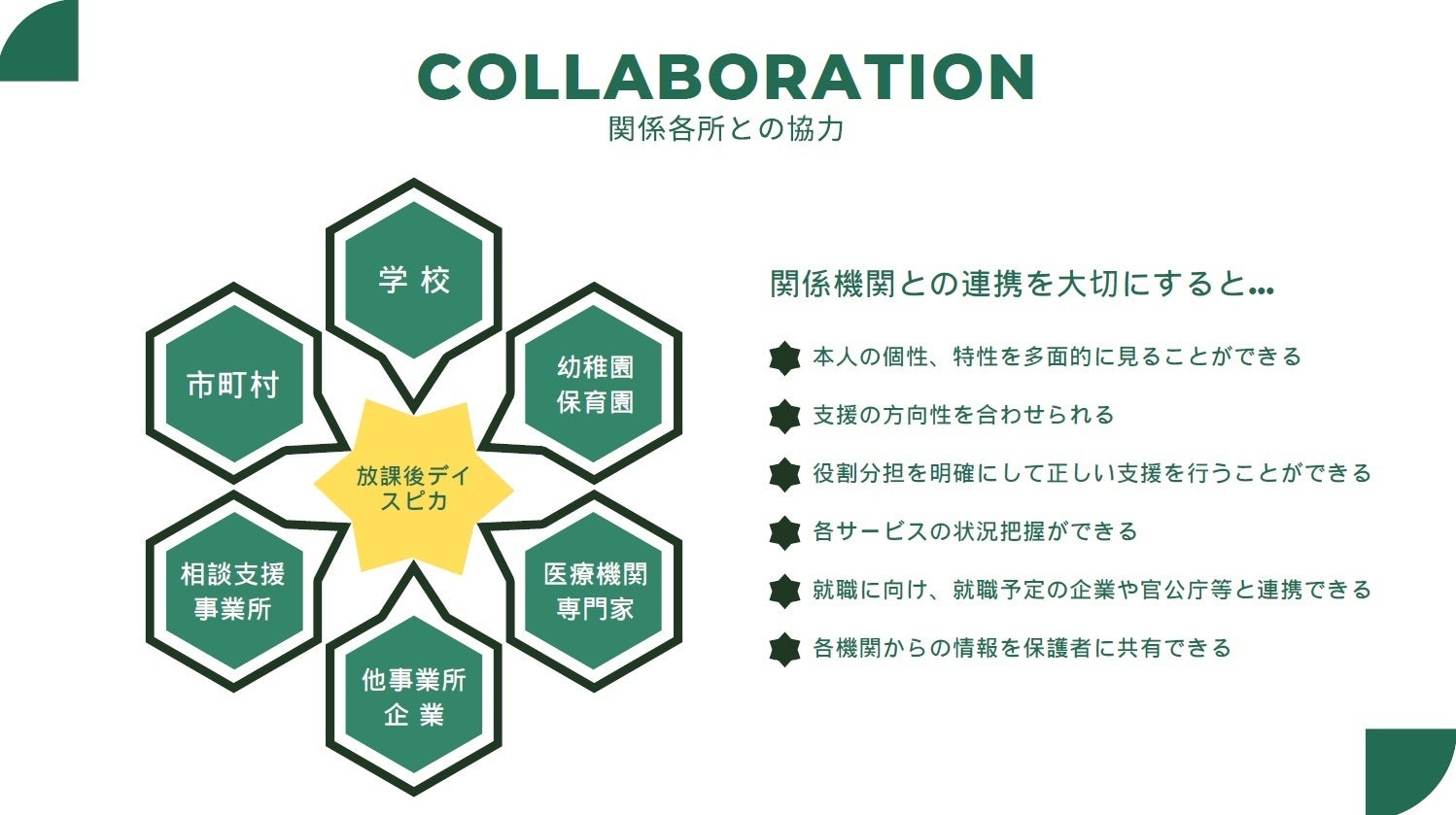 子どもたちと関わるさまざまな機関と連携・協力することで、個人個人の個性・特性を多面的に見ることができるとともに、支援の方向性を合わせられます。分断された支援でなく、包括的に支援することが可能となり、社会に出る時に備えていけるように伴走します。