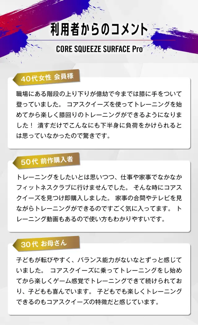 これらの経験を活かし、私たちは常にお客様のニーズに応える製品作りを心がけています。コアスクイーズサーフェスプロも、私たちの長年の知見と経験に基づいて開発された製品であり、皆様のトレーニングライフに新たな価値をご提供できるよう、引き続き取り組んで参ります。