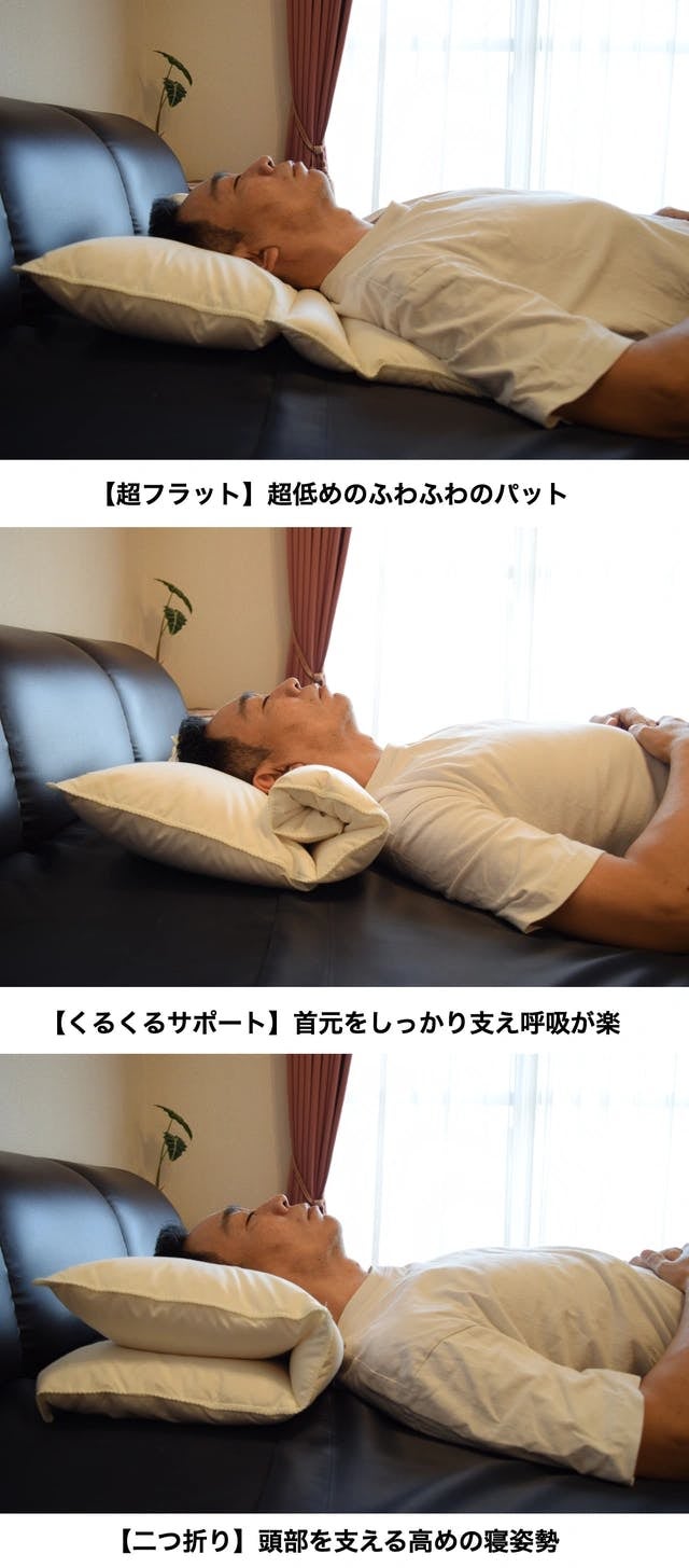 周りに迷惑をかけずに眠りたい理想的な寝姿勢は、心地よくすこやかに整い呼吸がしやすい寝姿勢に自分でカスタマイズ!使い方は簡単!『超フラット』広げるだけ『くるくるサポート』丸めるだけ『二つ折り』半分に折るだけ!