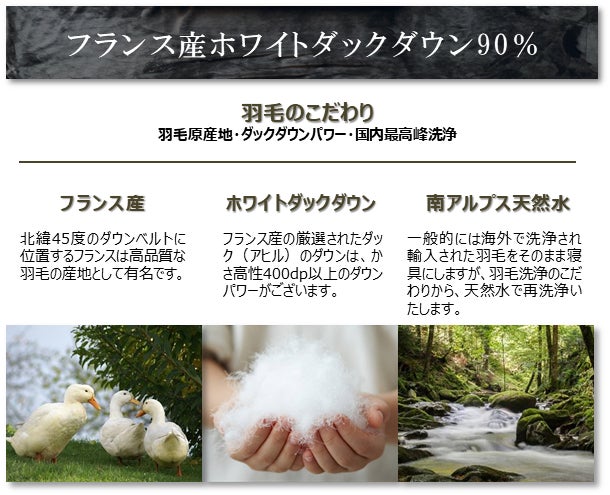 特徴は、やわらかさ、通気性、耐久性、洗濯可能性、体圧分散です。フランス産ホワイトダウン90%、ダウンパワー400dp以上の羽毛と、ダニやホコリを通さないアルファイン®生地を使用。