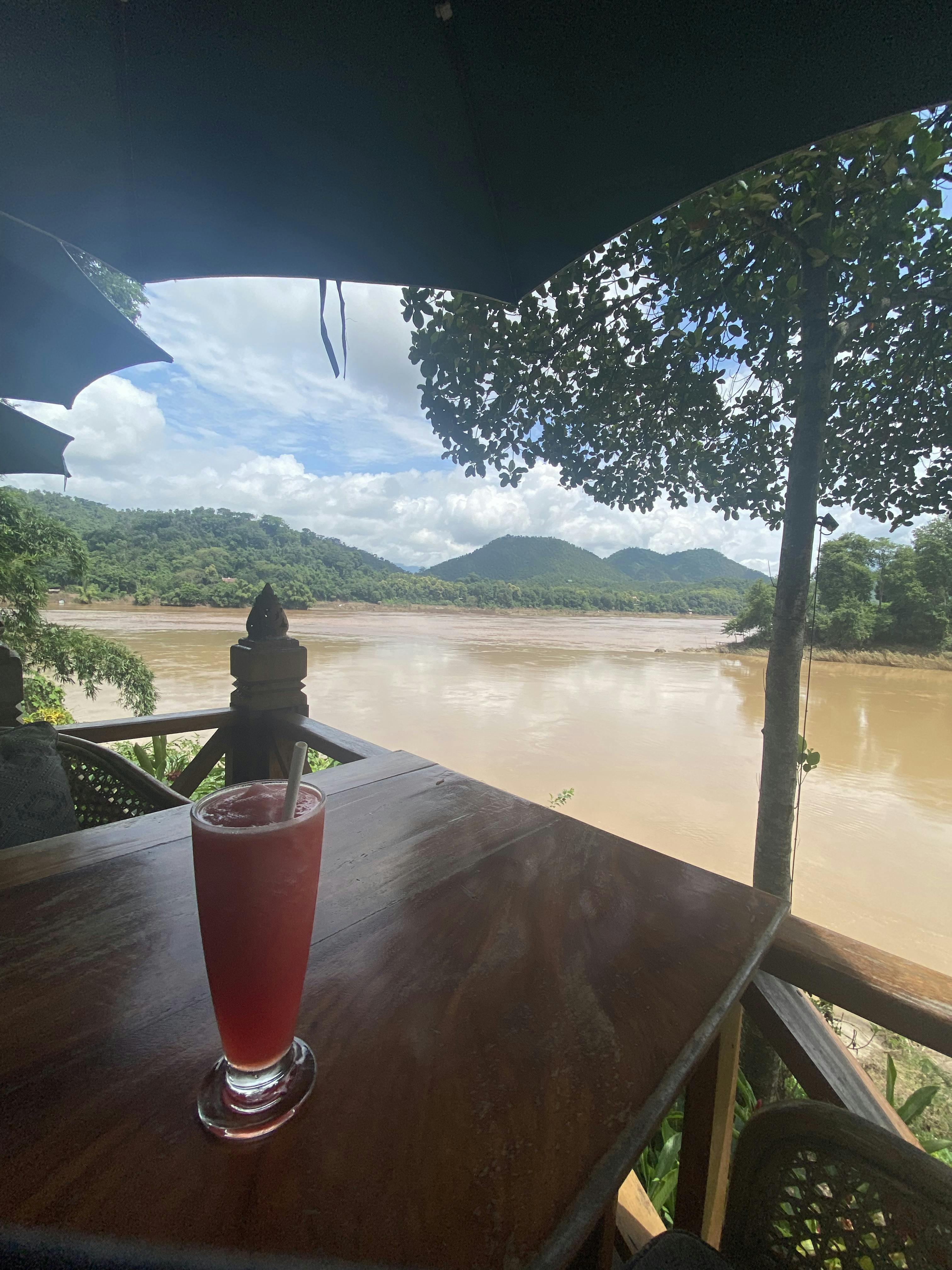 ↑ラオスのルアンパバーンという場所のカフェから望むメコン川。実際に見ると、雄大な自然に飲み込まれる感覚があります。
