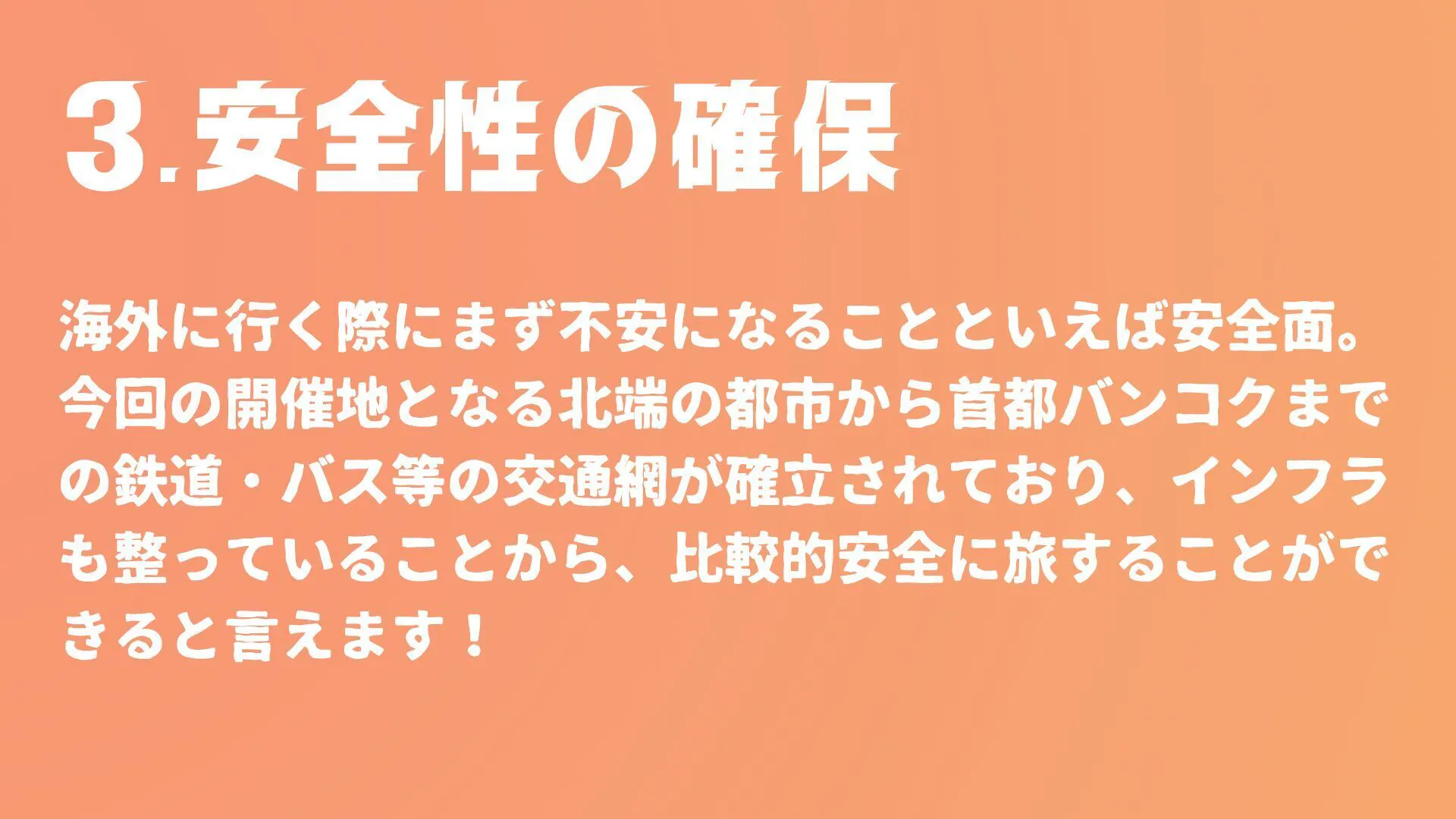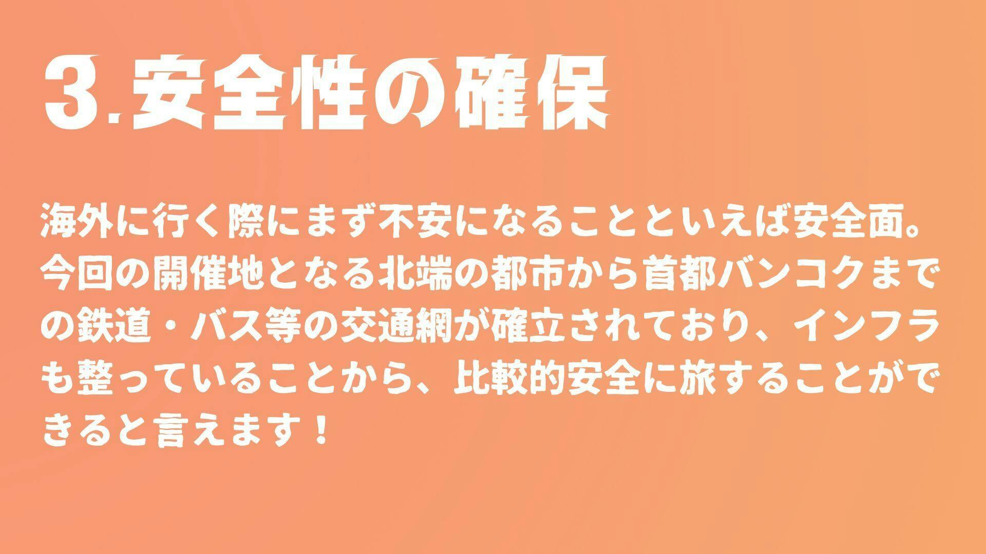 3つ目のの安全性の確保については、すでに現地の旅行業者様と提携しており、研修時もサポートしていただきます!