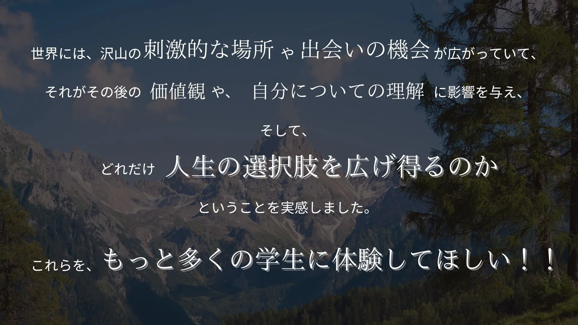 どれが良い、悪い、とは一概には言えませんが、世界には日本とは全く異なる「当たり前」があって、刺激的な場所・出会い・交流の機会が広がっている。少し背伸びをして冒険し、それらに触れることが、視野を広げ、不確実性の高い現代で生きていくための資質を得る第一歩となり、また、人生観や自分自身の価値、また将来の目標設定に大きな影響を与えうるのではないかと思うのです。