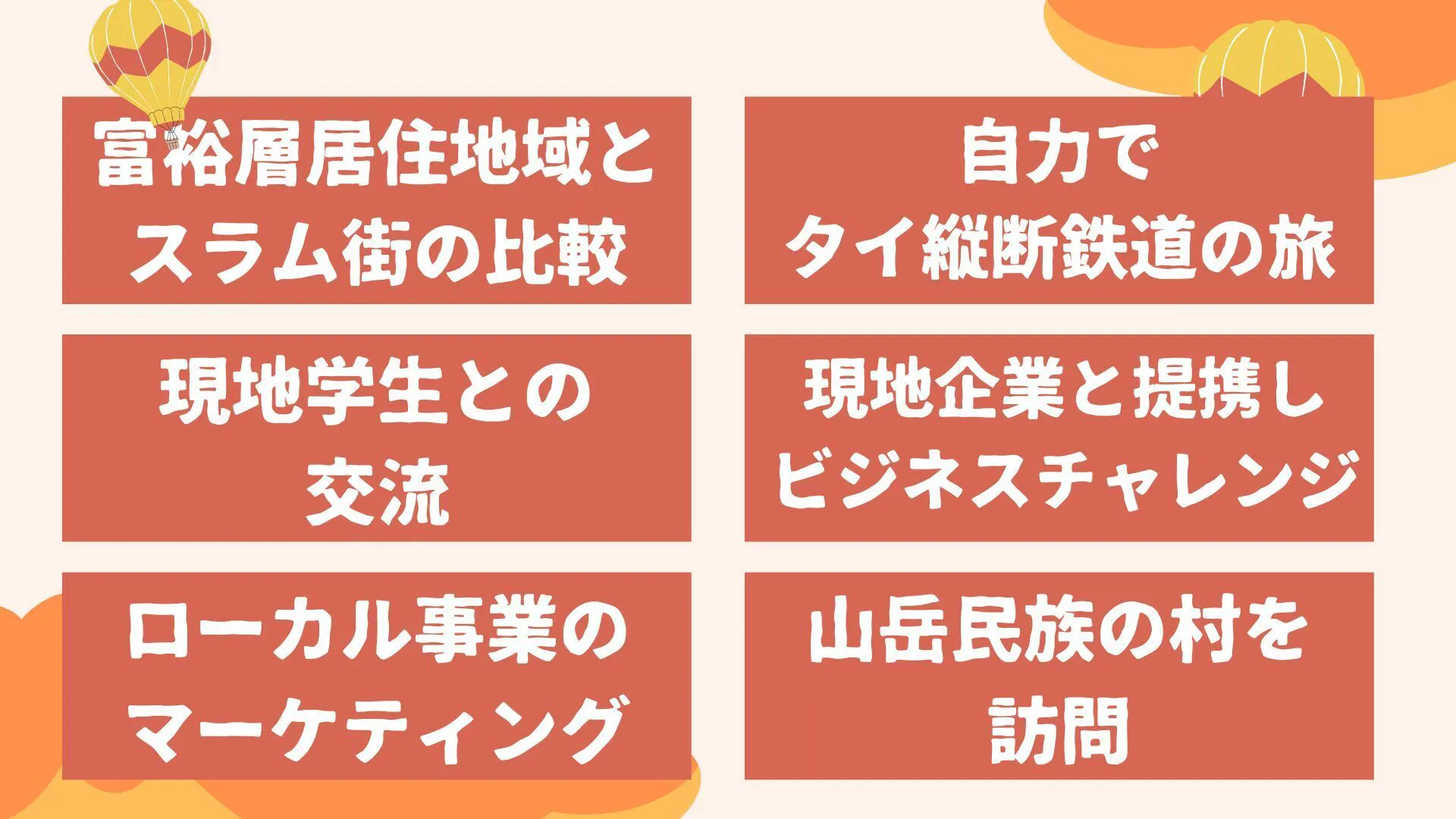 そうは言っても、見知らぬ土地・人々・社会での経験を得ようと個人で計画・実施するには、安全面やマインドの面で限界があります。そこで、学生約20名を集め、「人生観を変える、最後の修学旅行」というテーマで研修を企画しています!