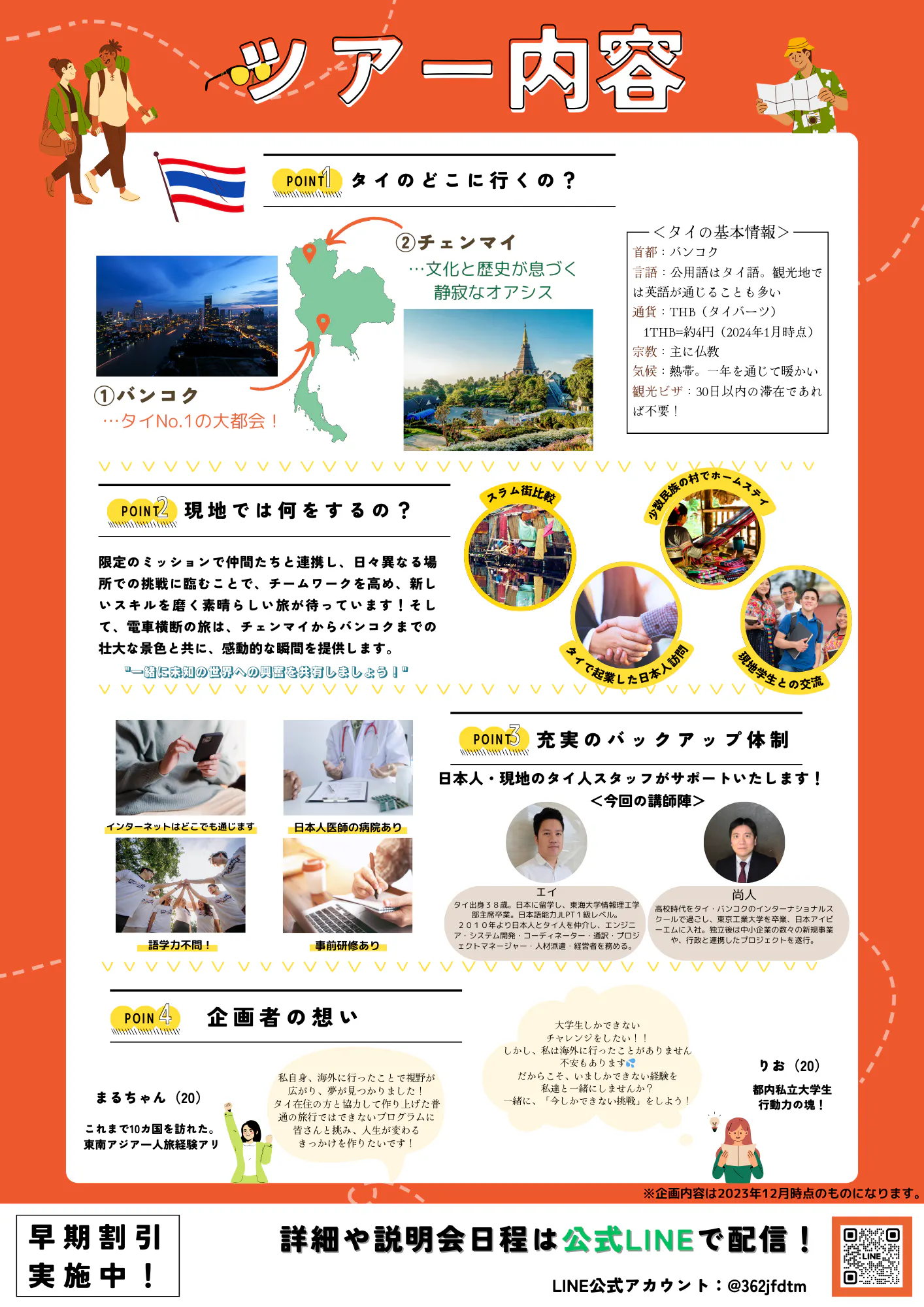 現在、社会人、タイの地元の方々、タイに住む日本人の協力を得ながら、一生に一度の体験を作り上げるべく企画に励んでいます!