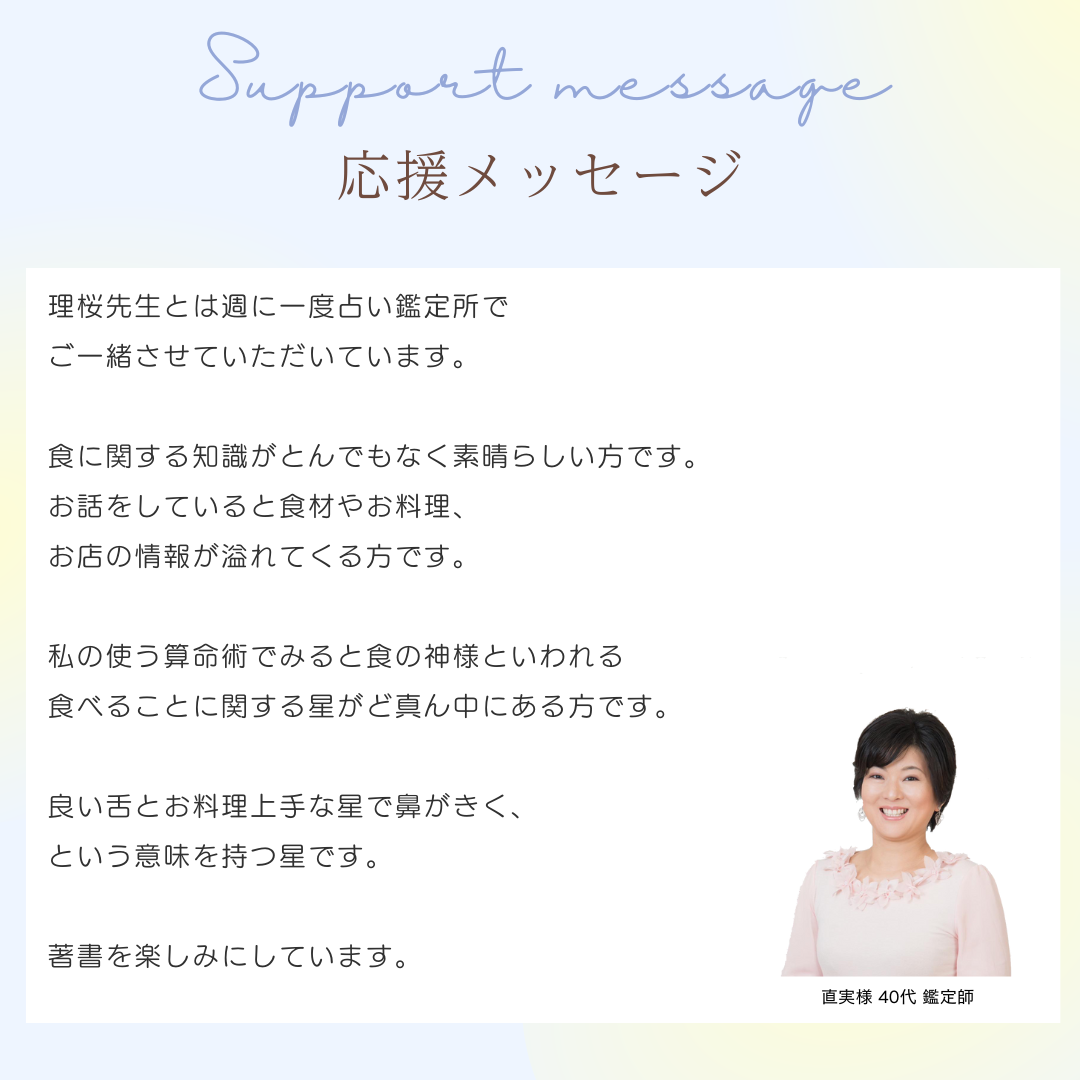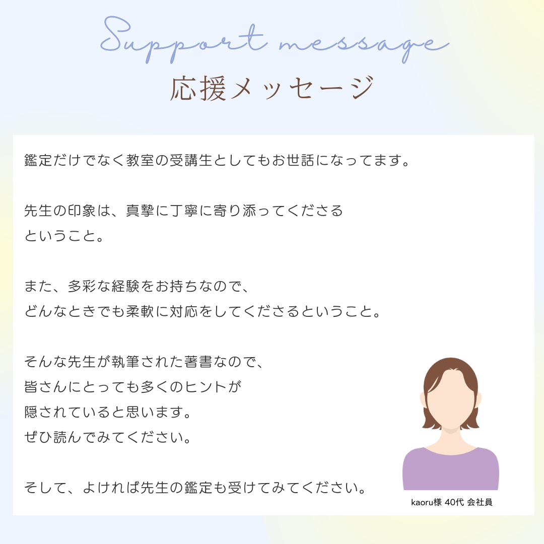 カウンセラーとして相談者様のお悩みを聞きながら、より深く、もっと親身に関わる事ができるよう、現在も東海林秀樹先生を始め東洋哲学や占術の専門家のもとで日々勉強を続けています。