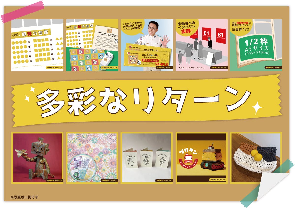 イベントにちなんだリターン商品を多数ご用意しております。例えば、参加アーティストの方から提供いただいた限定のペーパーアート作品だったり、わくわくさんこと久保田さんとお話が出来たり、企業様向けに協賛枠やパンフレットへのPR枠もありますので、ぜひご支援のほどをお願い致します。