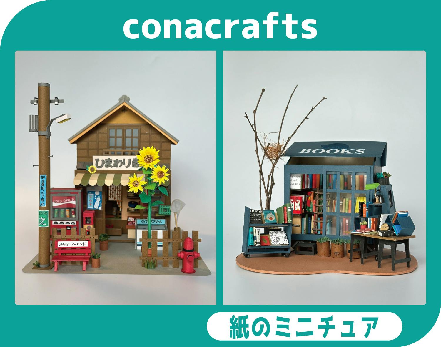 ハワイアンテイストなショップや、オシャレなカフェ、どこか懐かしい昭和な街角など、どの作品も細部にまでとてもこだわって作られているのですが、リアルだけでなくポップで可愛らしいのがconacraftsさんの特徴です。