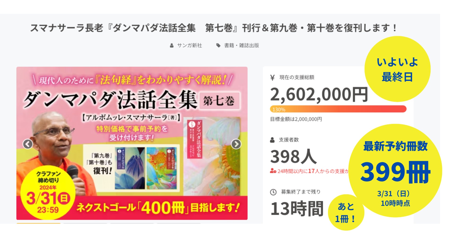 現在、ネクストゴール「400冊」を目指して取り組んでいますが、3月31日(日)10時時点で「予約冊数399冊」です。目標達成まで「あと1冊」というところまできています。