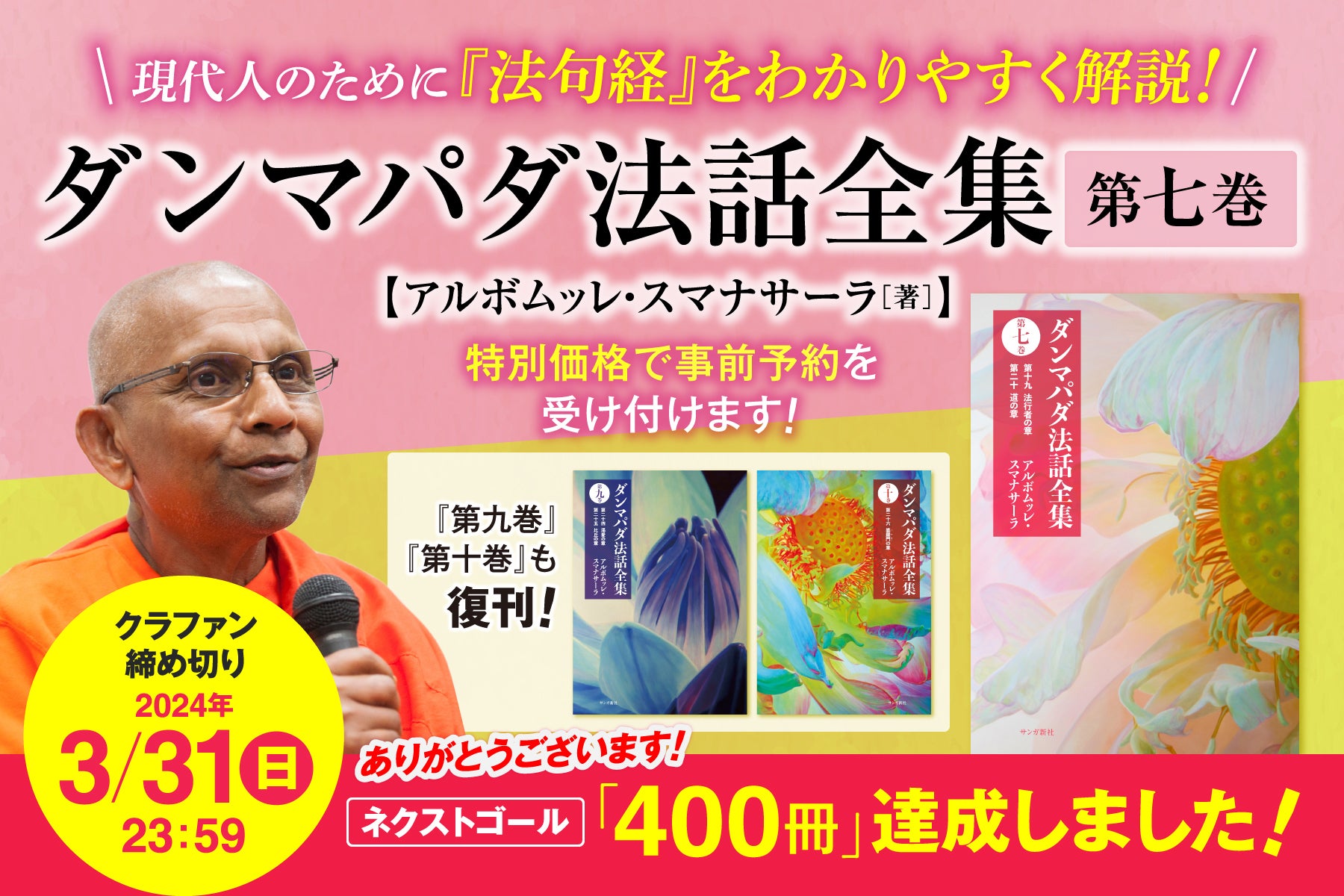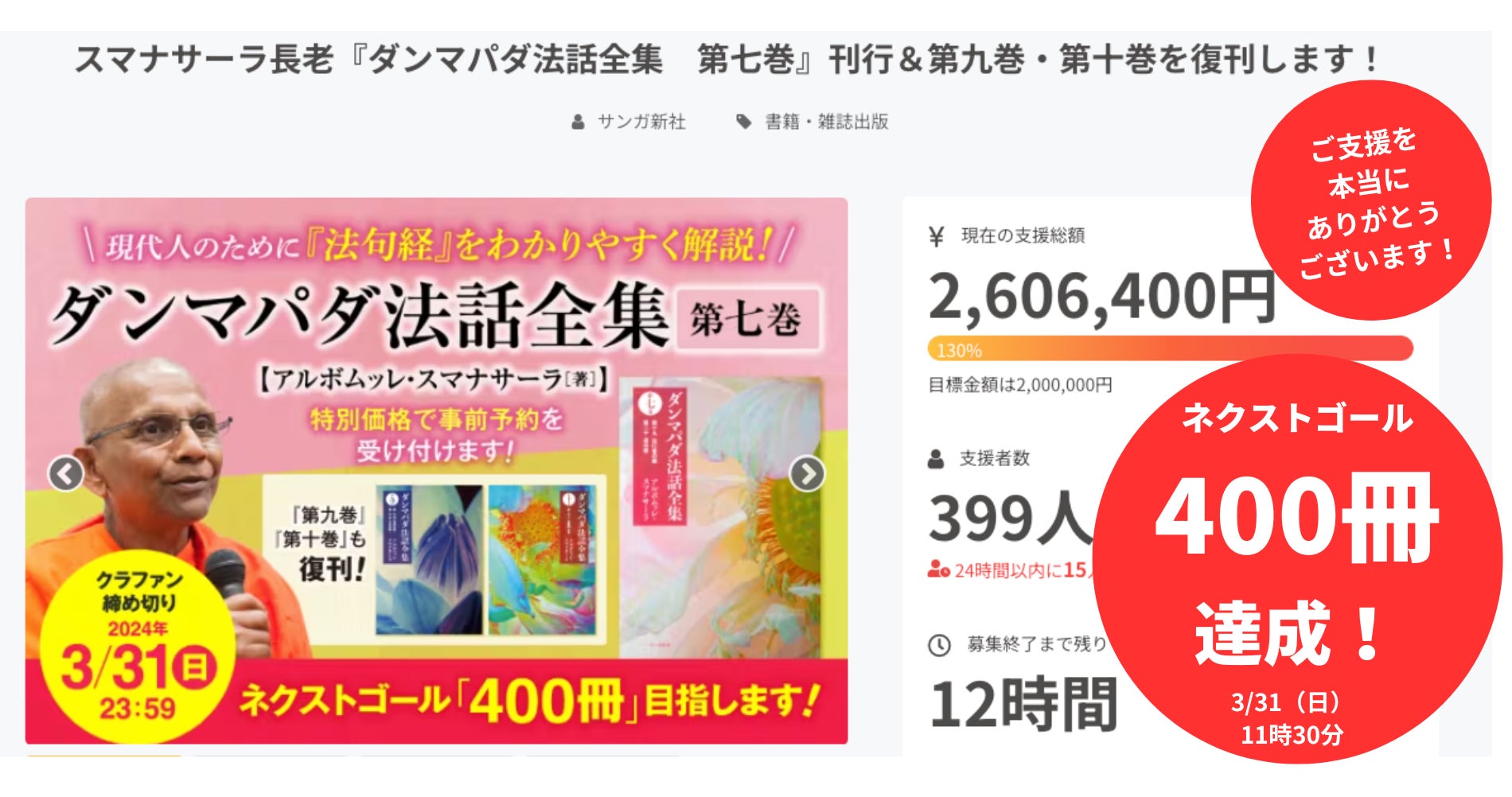 2024年2月23日に200万円の目標額を掲げてスタートした「スマナサーラ長老『ダンマパダ法話全集 第七巻』刊行&第九巻・第十巻を復刊します!」クラウドファンディングは、3月20日に目標額に到達し、その後、ネクストゴールとして「400冊」という目標を掲げました。