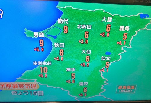 12月16日、朝のテレビの天気予報。能代の最高気温は9℃。真冬の秋田にしては少し暖かい